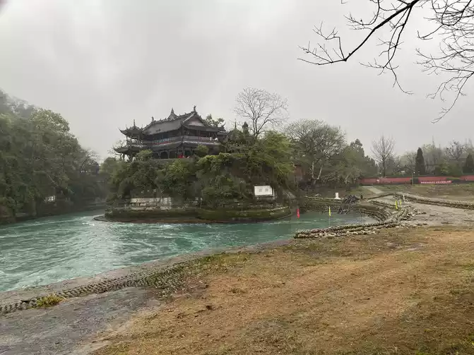 The picture shows the Yuzui watershed embankment, which is the water diversion project of Dujiangyan, named because of its shape like a fish mouth. It stands in the heart of the Minjiang River, dividing the Minjiang River into two rivers: inner and outer rivers. The fish mouth uses the terrain and terrain to cleverly complete the task of diversion and diversion, and plays a role in automatically adjusting the water volume under different water level conditions during the flood and dry seasons.