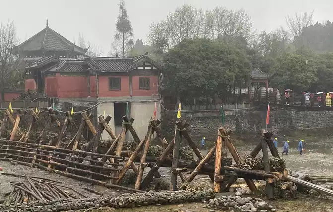 The log tripod on the left in the picture above is called the "closed water tripod", also known as the raft. It is often used for interception, flood control, water adjustment, embankment rescue, etc., and is one of the highly effective water control engineering facilities. Pebbles placed in the bamboo cage on the ground are called "bamboo baskets", also known as bamboo cages. When Li Bing founded Dujiangyan, he used this method of cage stone, which was simple and cost-effective. This method has been passed down through the ages and is still widely used in flood prevention and rescue; The four iron rods in the middle are called "lying iron", which is the standard for washing the beach buried in the "Fengqiwo" of the Neijiang River, and it is also a sign of the depth of the Neijiang riverbed being repaired every year. According to legend, when Li Bing built the weir, stone horses were buried under the bed of the Neijiang River, which was used as the standard for the depth of the beach every year, and later evolved into a lying iron.The existing four are the lying iron buried in the fourth year of Wanli in the Ming Dynasty, the third year of Tongzhi in the Qing Dynasty, the sixteenth year of the Republic of China and 1994, and they still play a role under the bed of the Neijiang River.