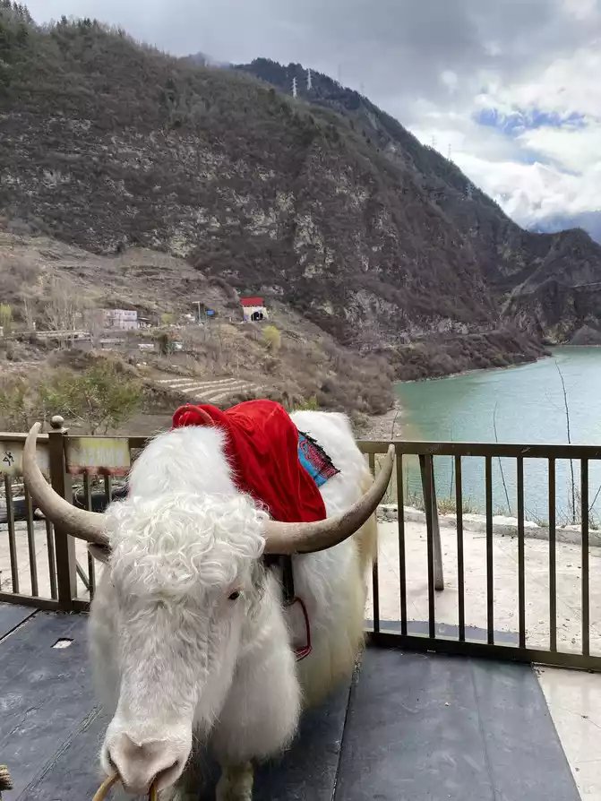 At about 14:40, we entered a simple bus rest area in front of Songpan Ancient Town, and the yak in front of us was waiting to make money in the service area. With mountains and lakes in the background, the scenery is really good!