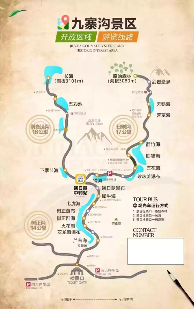 Note: In winter, the right-line bus does not enter the primeval forest scenic spots, the Swan Sea scenic spots and the Fangcao Sea scenic spots.