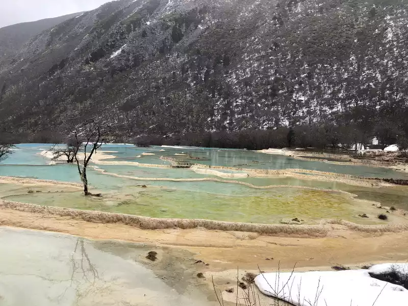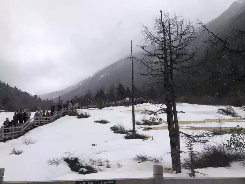 was introducing the dangers of the yellow dragon along the way, mainly the danger of altitude sickness, a series of problems of altitude sickness, and did a lot of strategies before going. I have been studying how to overcome the discomfort of 3,500 meters above sea level, and along the way, I also met the staff who got on the bus to introduce the plateau potion, and refused to drink the potion. I didn't buy Rhodiola oral liquid either. In the afternoon in Huanglong, I started to build the cable car, and it took about 10 minutes to reach the top of the mountain, and my breathing began to become uncomfortable. Go to the entrance of the sightseeing staircase and climb the colorful pool, which says 350 meters. These 350 meters are blood and tears. My husband refused to go up the mountain, and I insisted on moving on. These few hundred meters, almost one step at a time, it took a full hour, a round trip, the sky was snowing, the snow-capped mountains were far away from us when they were in Jiuzhaigou, and now it seems to be on my head, so close, so majestic, it is so difficult to breathe. Colorful ponds are beautiful, and during the same dry season, many pools along the way have no water and are covered with ice and snow. I asked my friends around me to take a lot of photos, and started to go down, not daring to walk fast, feeling quite comfortable. Coming down at the transit place, my husband insisted on making a cable car to go back. I think it should be possible to go down 4,000 meters, the tour guide said that I can do it in 1 hour, so he made a cable car down the mountain, I walked down the mountain, and later I realized how wrong this decision was!