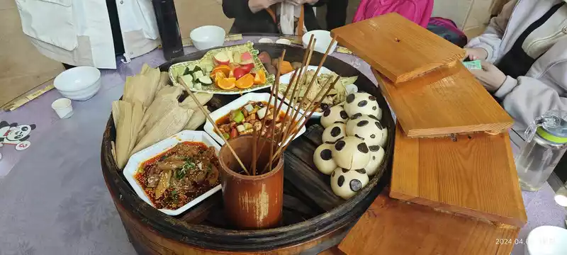 Here is the afternoon dinner: Panda Snack Banquet - Panda Steamer, Guanxian Special Snacks, Fu Rongbao, Spicy Meat Sandwich Buns, Lai Tangyuan, Guyan Shredded Chicken and other delicacies, every meal is always accompanied by butter tea, which is very good, which is a source of energy in the plateau area