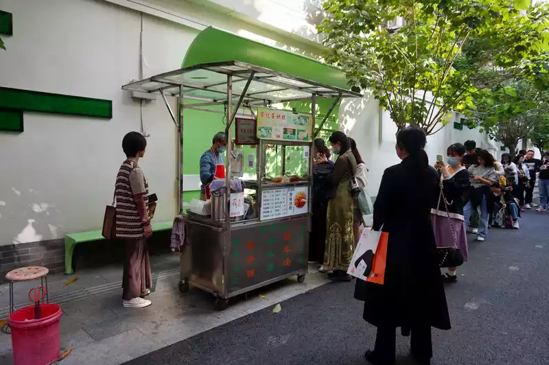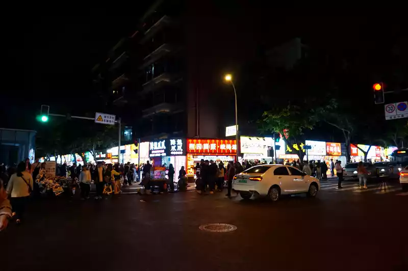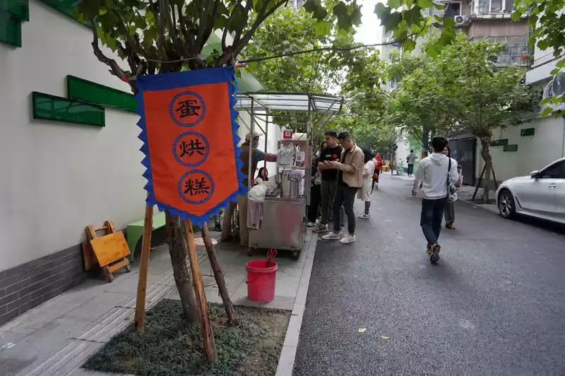 It's about a 20-minute bike ride from Dongjiao Memory to Jianshe Road. It's quite lively at night, with people all over Jianshe Road. However, there are only a few popular online restaurants with long queues, so we followed others and queued for the ghost buns and roasted sweet potato skin.