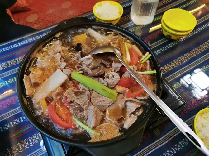 When you arrive at the reserved hotel in Jiuzhaigou on the same day, the bus will stop along the way according to your needs. The hotel we stayed in is the Four Seasons Fairy Tale Hotel, the hotel is okay, there are many hotels around here, not too far from the gate of the scenic spot, there are some local yak meat soup pots, Tibetan food, music restaurants, etc. around. We arrived at the hotel at about 4:30 p.m. that day, and after resting for half an hour, we went downstairs to check the diet, and chose the Roblinka Tibetan Meal Bar to eat the local yak soup pot, the yogurt was good, and there were more radishes.
