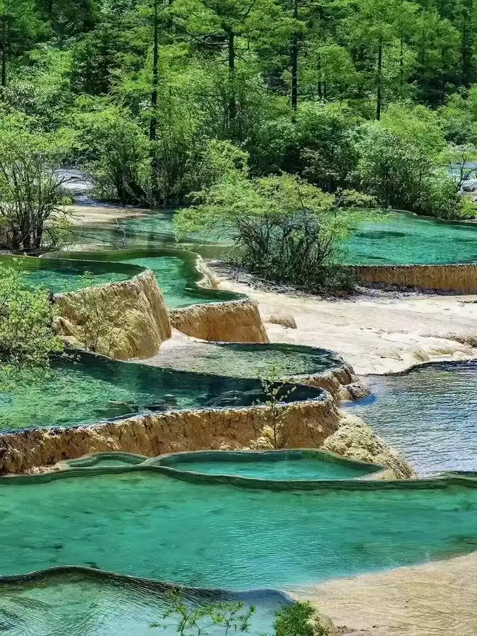 Morning: It is recommended to take the ropeway to the ropeway station to visit Huanglong, and walk from the ropeway station to the colorful pond (the altitude of this section of the road is relatively gentle, you can enjoy the scenery of the primeval forest along the way, and there are many attractions along the way down the mountain: Zhengyancai Pond→ Suluo Yingcai Pond→ Mingjing Reflection Pond→ Bonsai Pond→ Jinsha Paving Floor→ Washing Cave→ Lotus Terrace Waterfall→ Waterfall Liuhui→ Welcome Pool