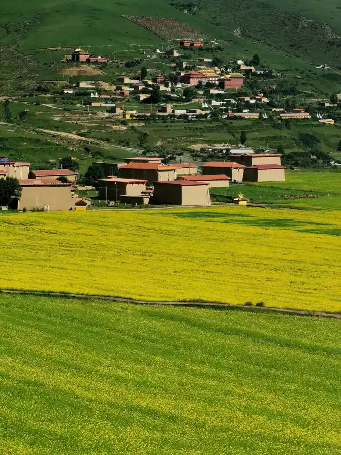 Noon: The large areas of rape flowers and meadows in Maikun Township on the edge of Aba County complement the red Tibetan-style buildings, coupled with the blue sky and white clouds, creating a pastoral landscape painting that opens and closes.