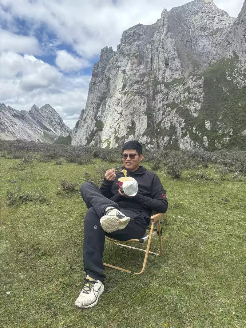 I took a break in the middle and found a relatively flat grassy area, although I didn't have a canopy, the outdoor tables and chairs were complete, and the plateau scrambled eggs, instant noodles, can be regarded as some new experiences on the journey.