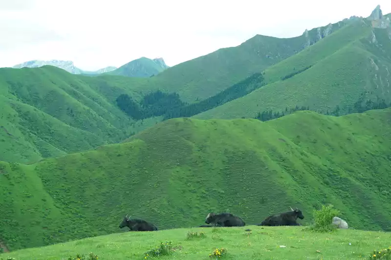 At about 11 o'clock at noon, he had left Xining and entered Xiahe County, Gannan Gannan Tibetan Autonomous Prefecture, and his eyes gradually became brighter, from near to far, and cattle and sheep began to appear in flocks in front of him. Passing through a village at a higher altitude, there is a long prayer wheel along the road, and turning around this village is its open grassland.