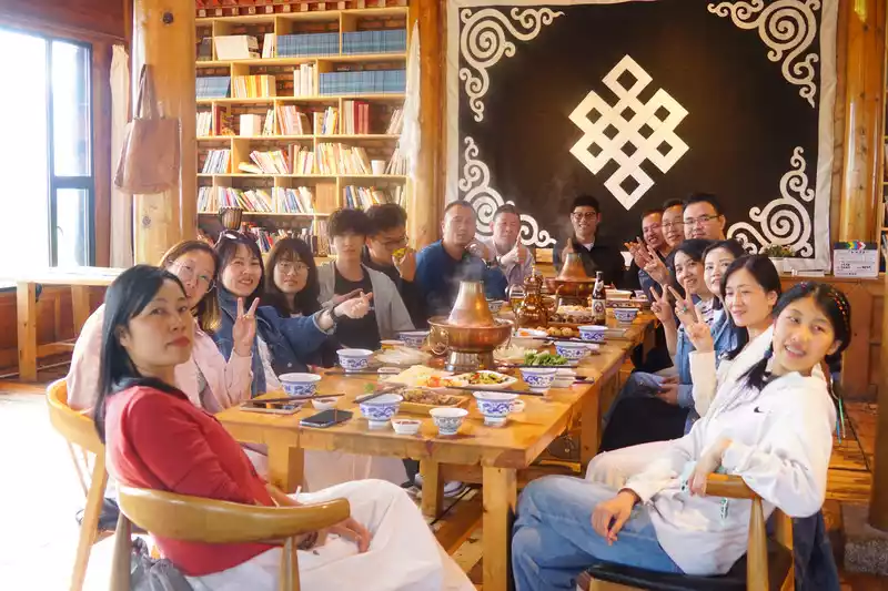 Arrive at the Internet celebrity restaurant "Uzerinka Tibetan Restaurant" for lunch at about 12 o'clock, the decoration and ornaments and their Tibetan characteristics, so taking pictures is more important than eating. Of course, the diet is also very distinctive, especially the ritual of lamb tripe wrapped in meat (stone cooked mutton). The 16 of us sat in a circle to experience Tibetan food and food, and of course, most of the diet has been improved to adapt to tourists from all over the country.