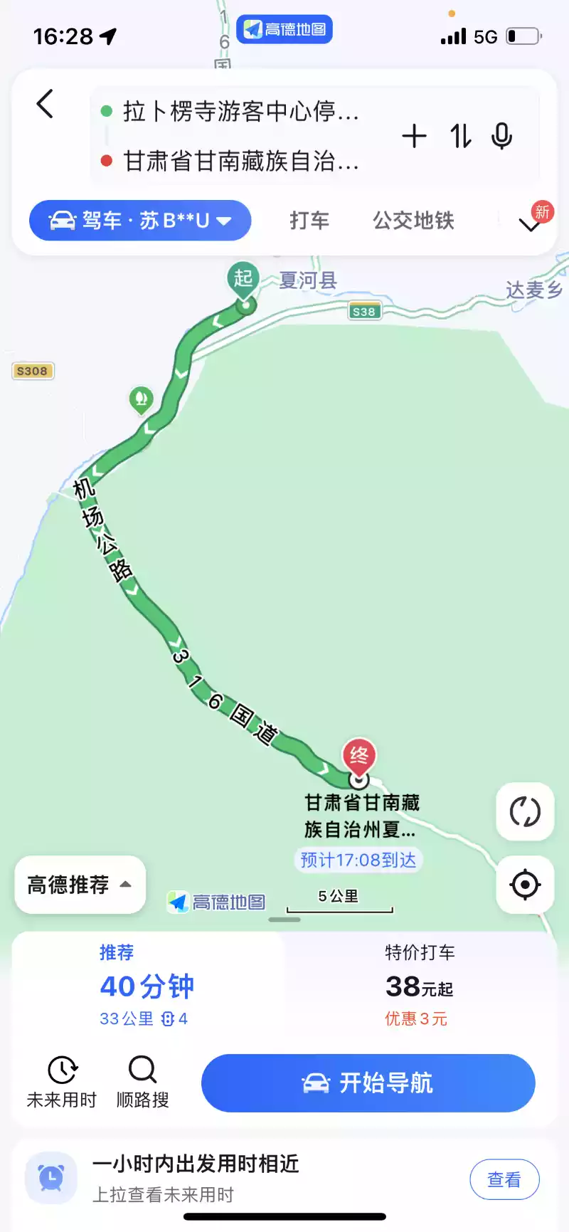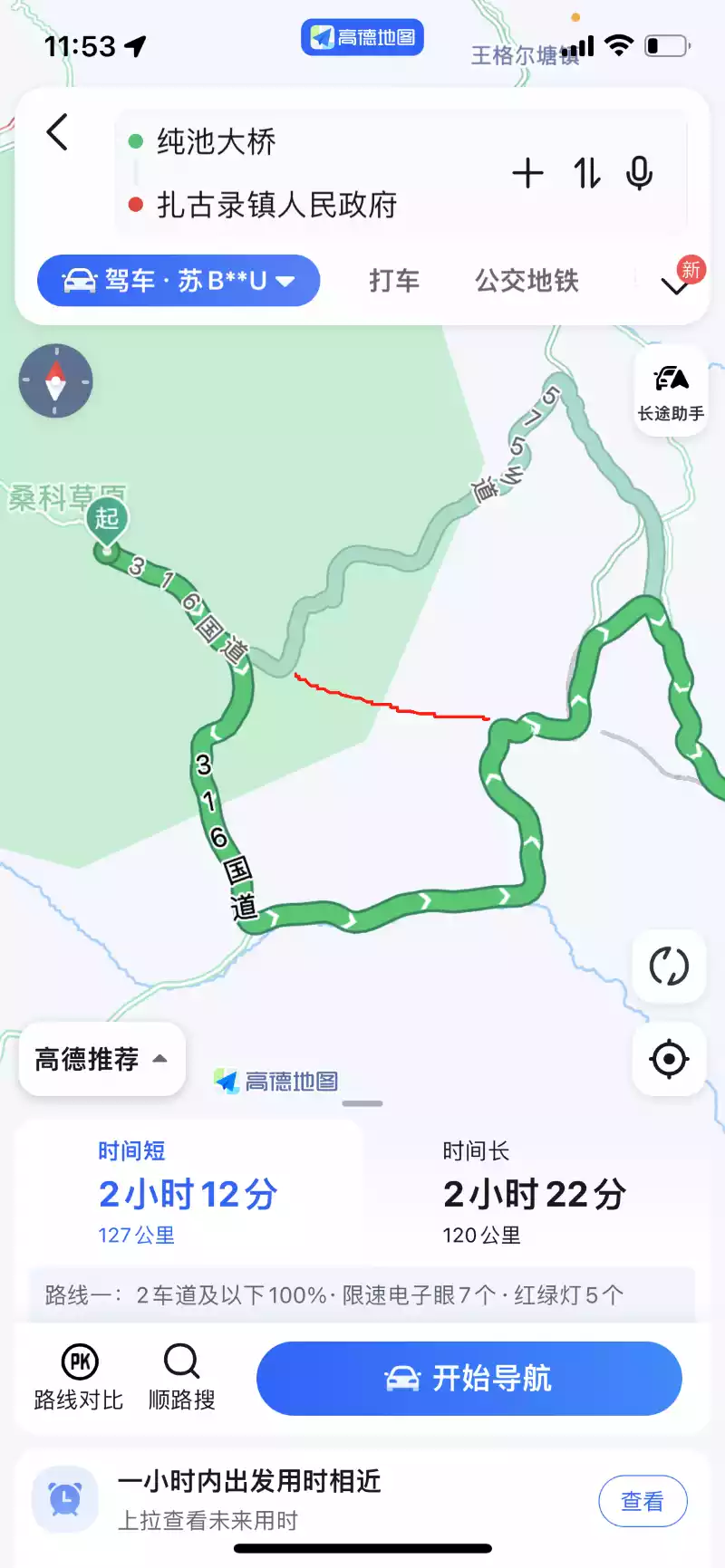 Navigation is also a skill, pull out of the Puleng Temple, if you directly navigate the town of Zagulu, it will allow you to bypass the Sanke grassland, more than 130 kilometers, and you can reach your destination in 2 and a half hours. So, open the map, select the map as the center of the Sanke grassland, pass the airport highway, and enter National Highway 316;