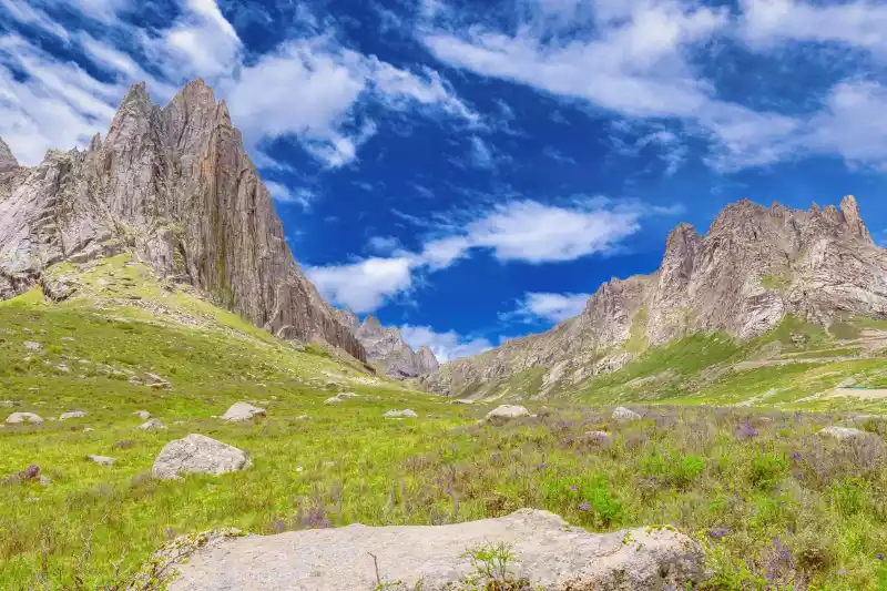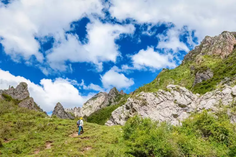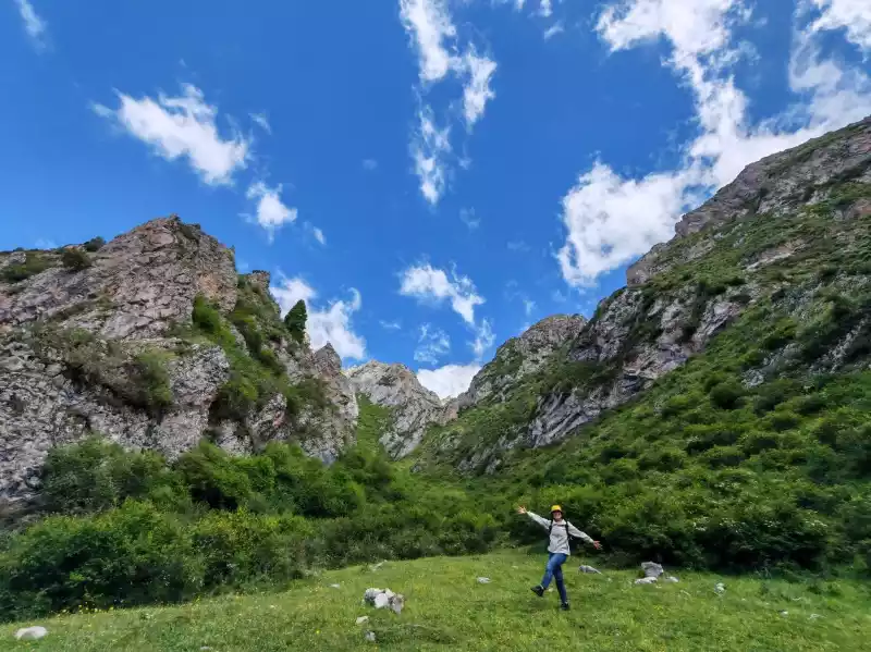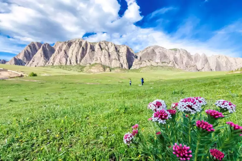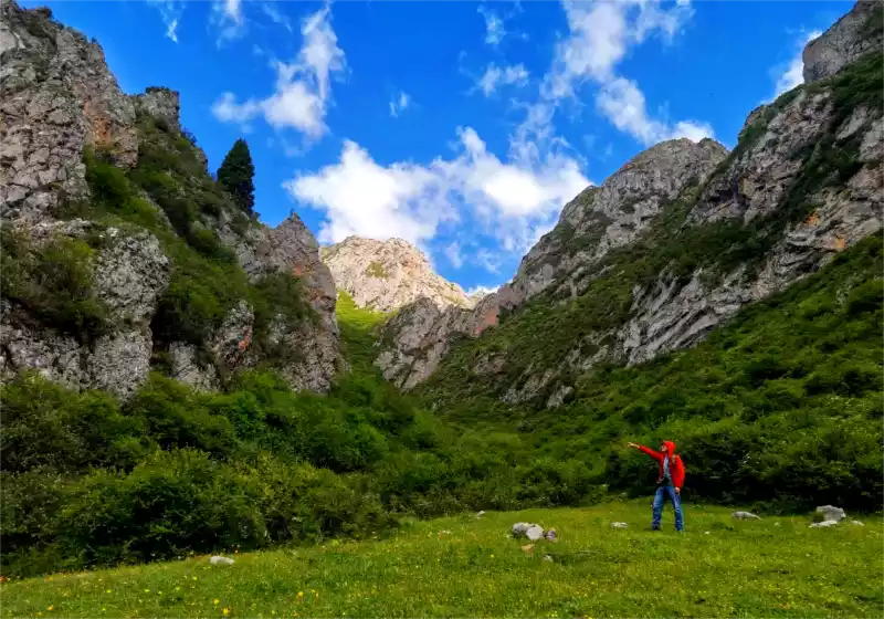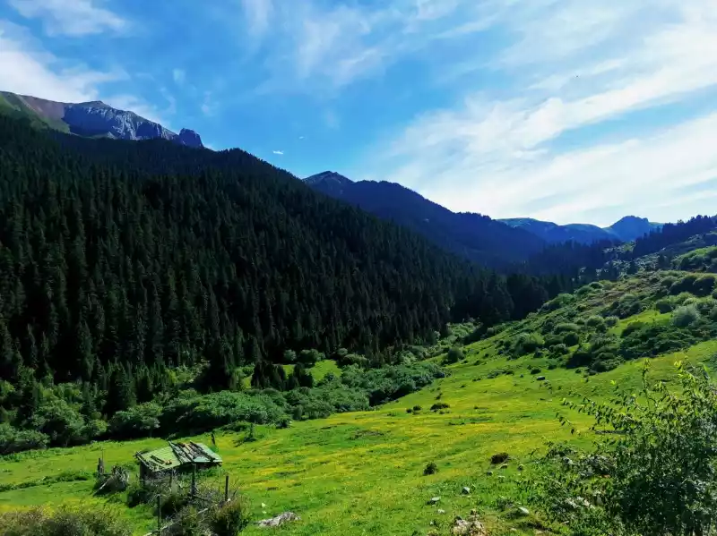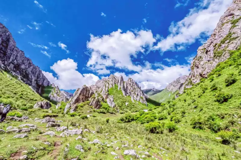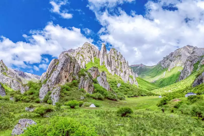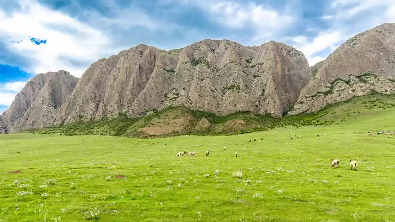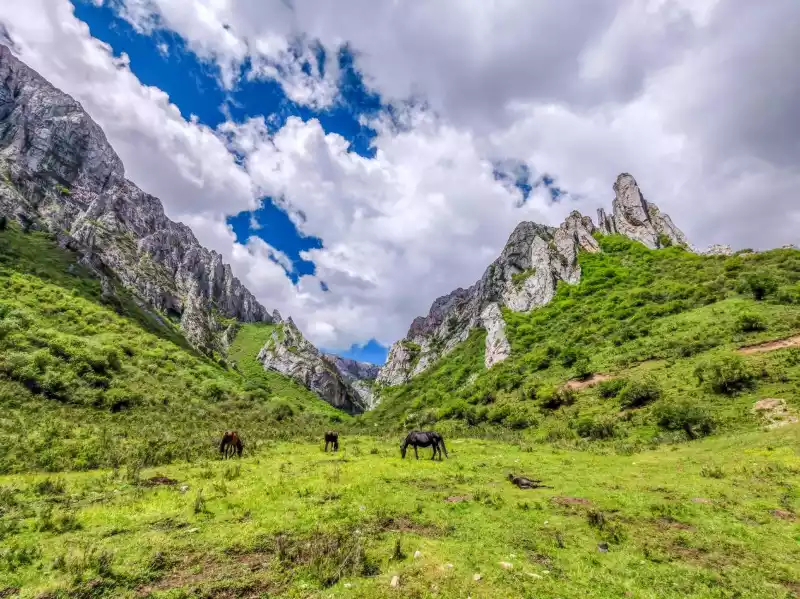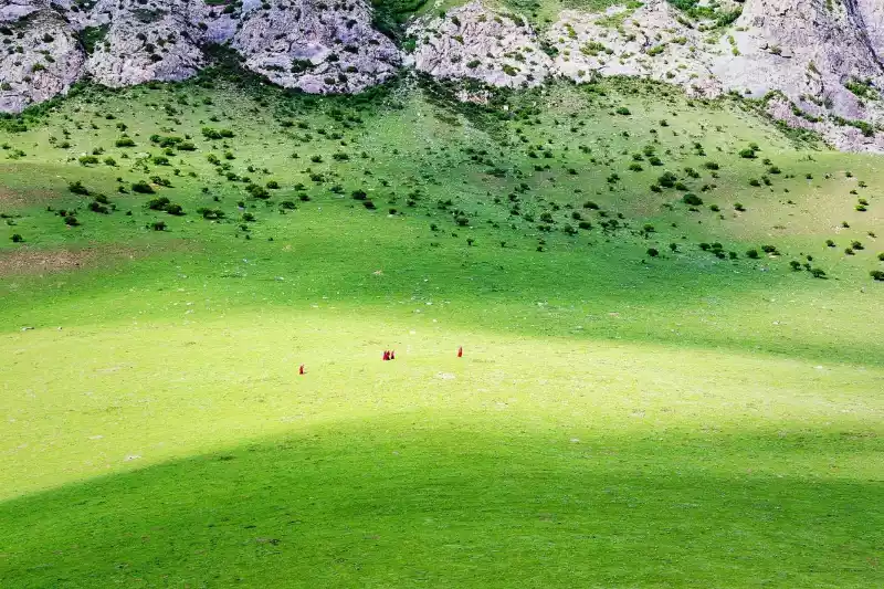 are occasional flat grassy slopes in the valley, and the steepness of the mountain peaks in the distance and the width of the grass near them form a picture of contrast but unusually harmony. And the characters in the wilderness have become a small but difficult to ignore embellishment.
