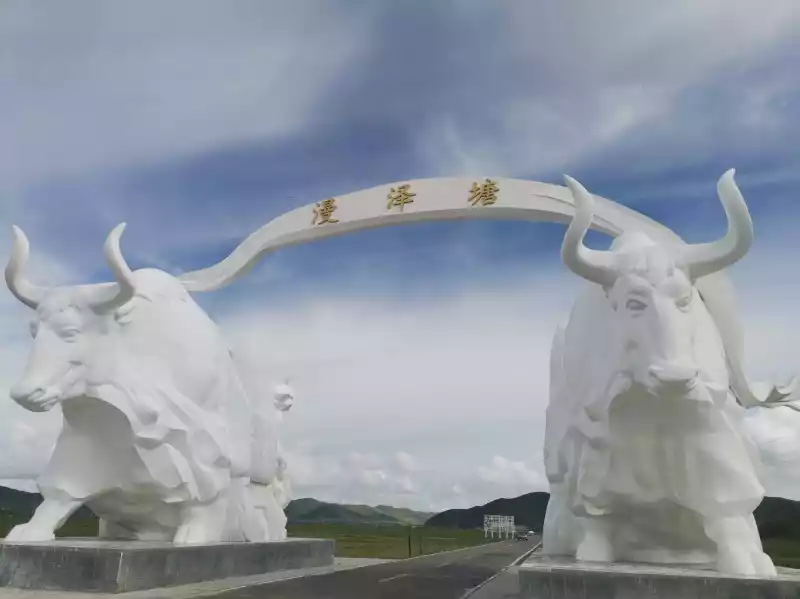 Although we didn't go to the first bay of the Yellow River, we found a replacement scenic spot "Manze Pond". It is more than 60 kilometers away from Tangke Town and is a scenic spot that has not yet been officially opened, and only registration is required during the trial operation period, and no tickets are charged. There are two giant yak statues at the gate of the scenic spot, which are very conspicuous. After entering, the car can drive all the way to the highest observation deck.