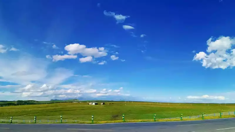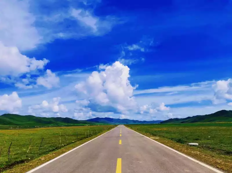 road on the grassland is straight and unobstructed, with an unobstructed view of the surroundings. You can see the sun at the end of the sky, the clouds, and the weather dozens of kilometers away.