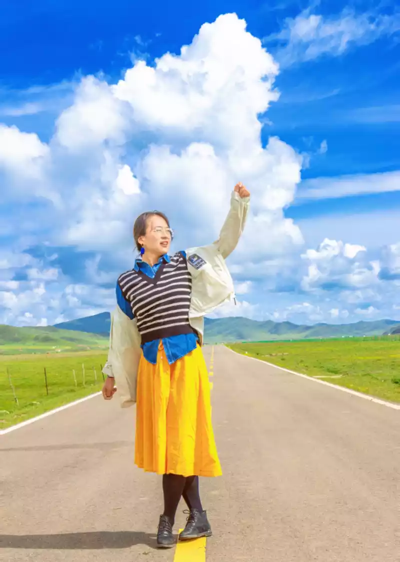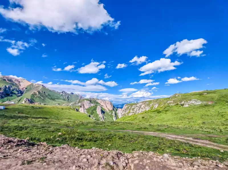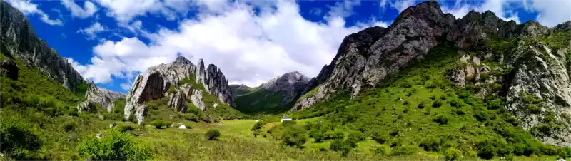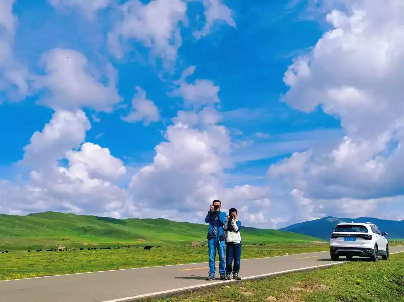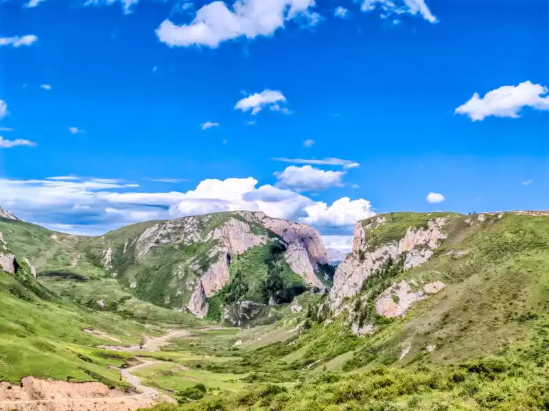 The end of this section of the road is the beginning of the Ruoerge Grassland, with two facing stone cliffs in the distance. The clouds float on the top of the mountain, as if within reach.