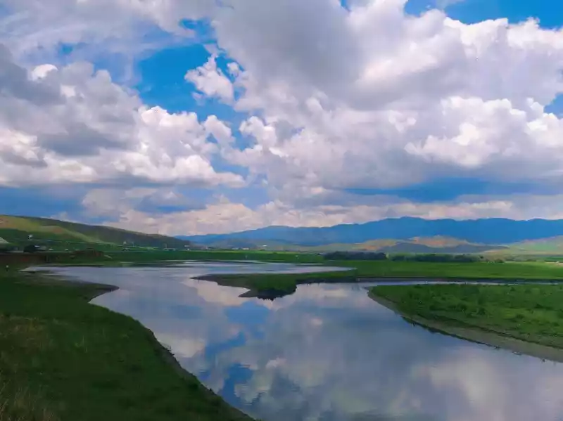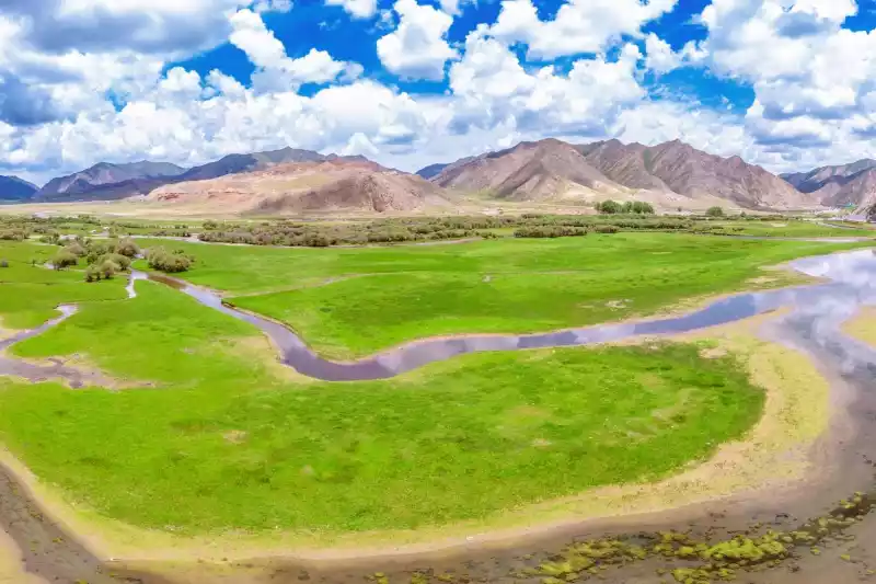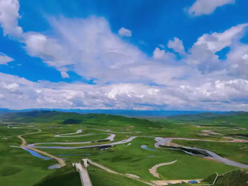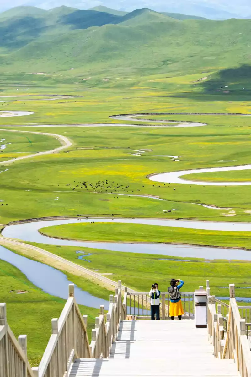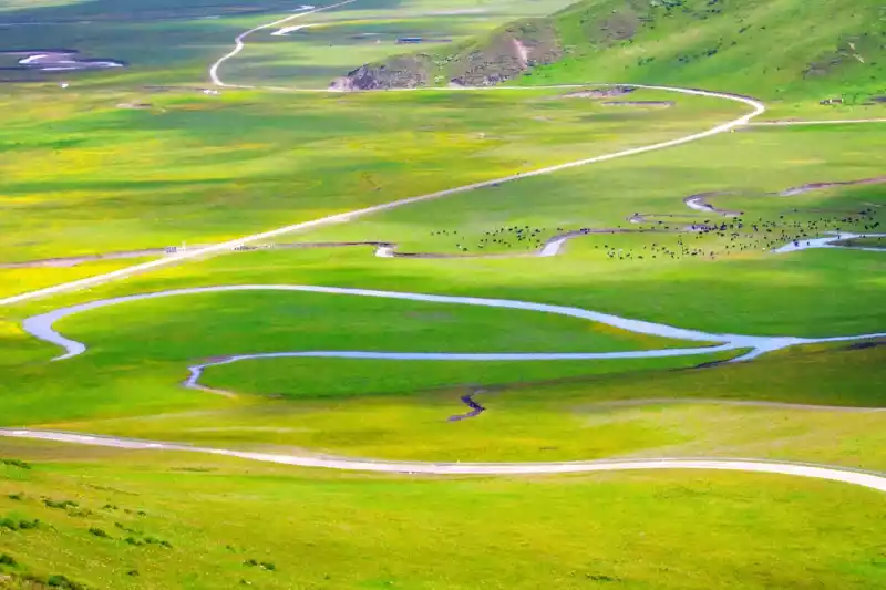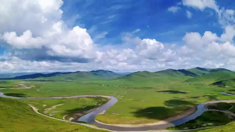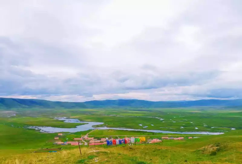 Looking down from a high place, you can see the winding posture of Jiaqu on the grassland.