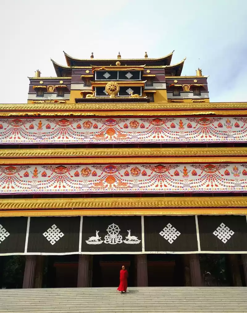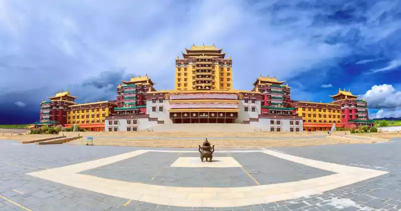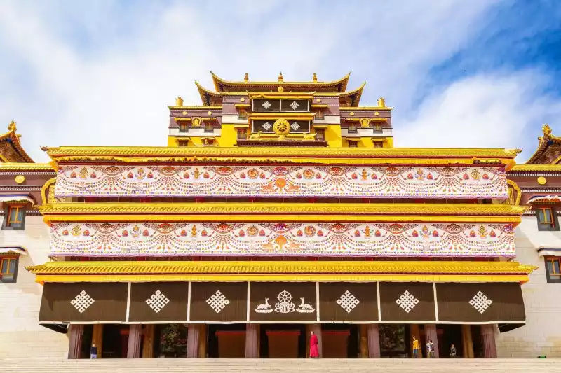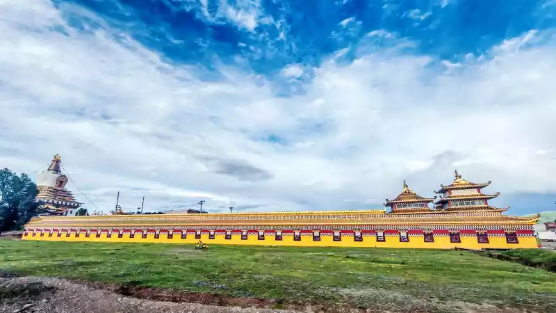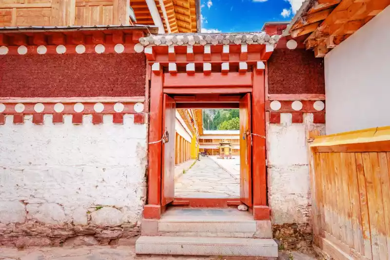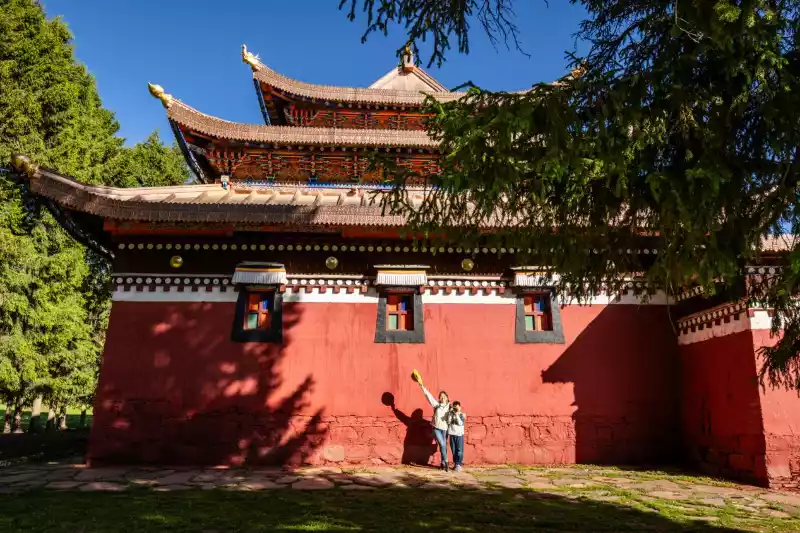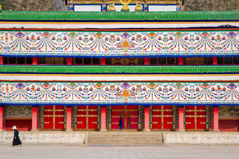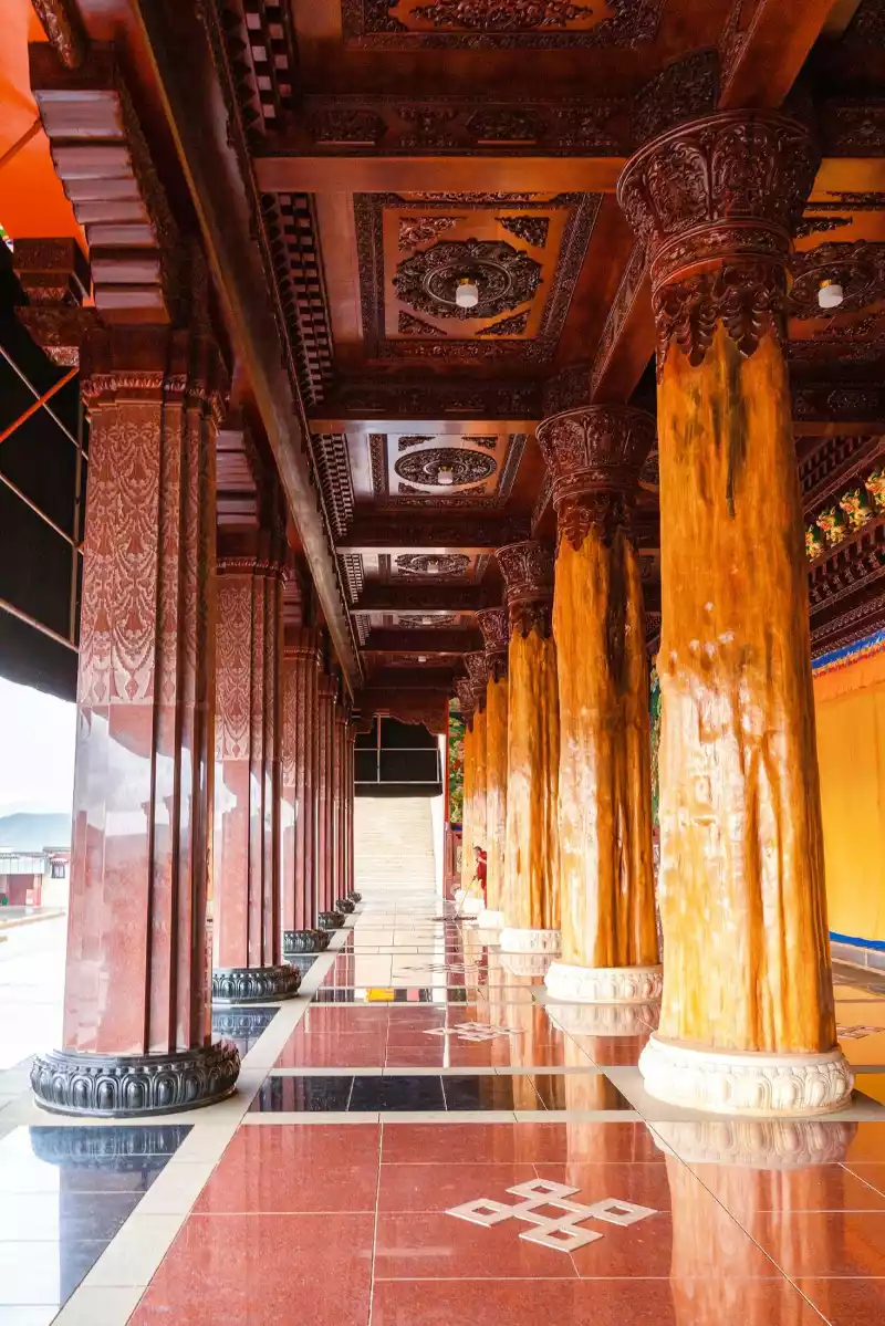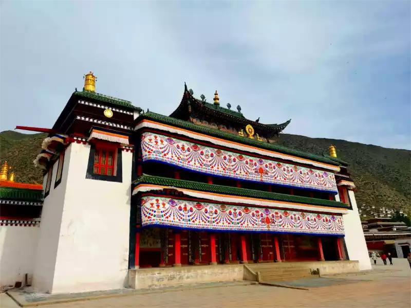 the outside, the thirty-five-meter-high main hall of the Gomo Monastery gives people a solemn and sacred feeling. Intricate decorations, extended corridors, empty squares, and thick nanmu columns in front of the hall highlight its low-key and luxurious in every detail.