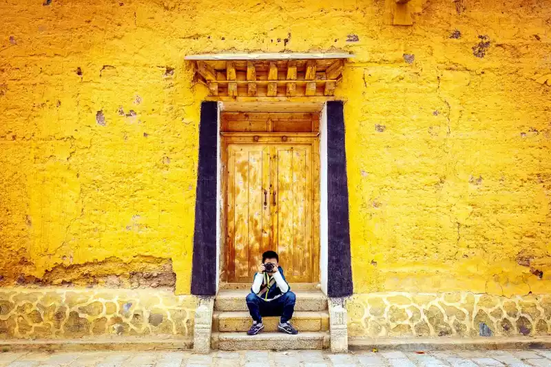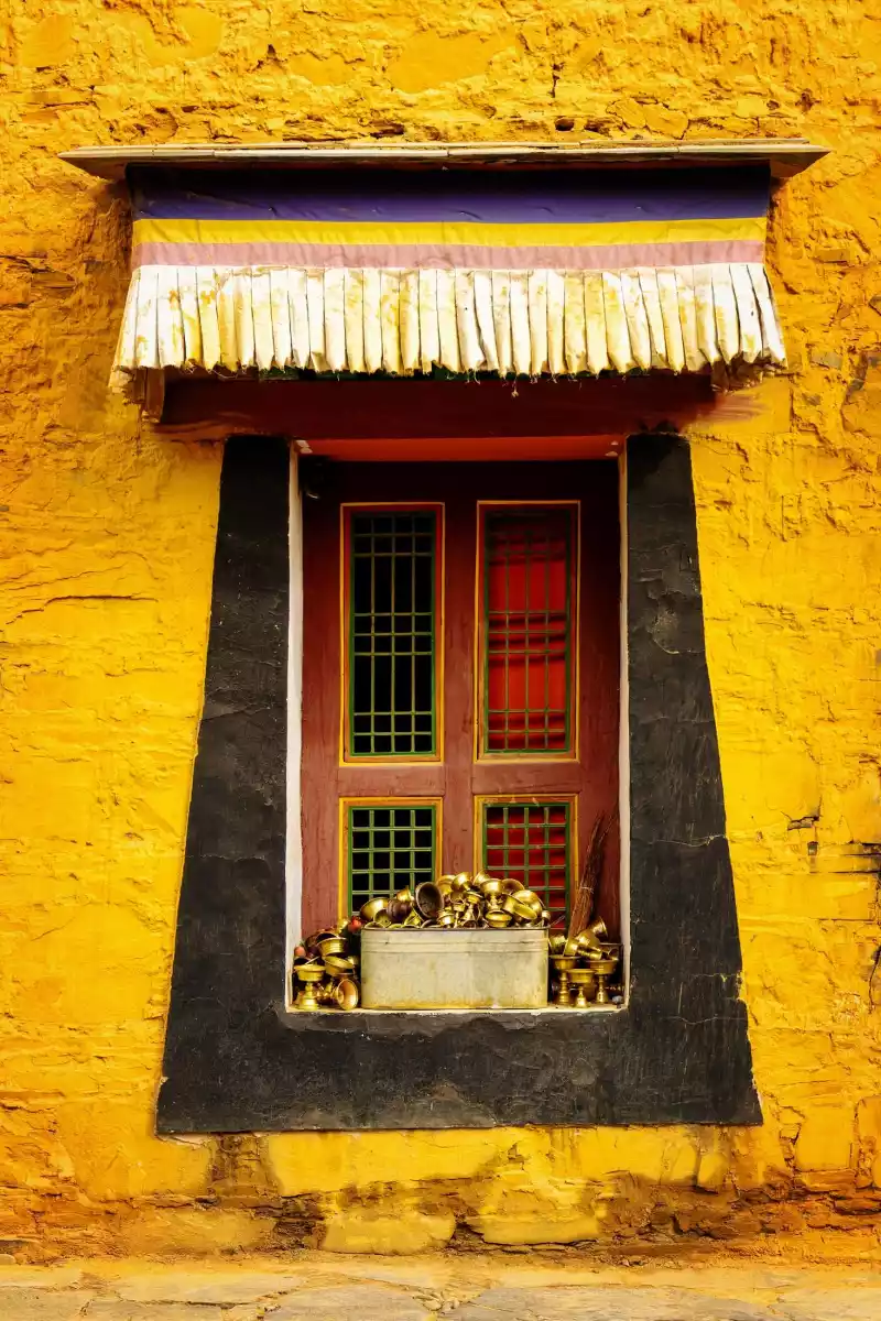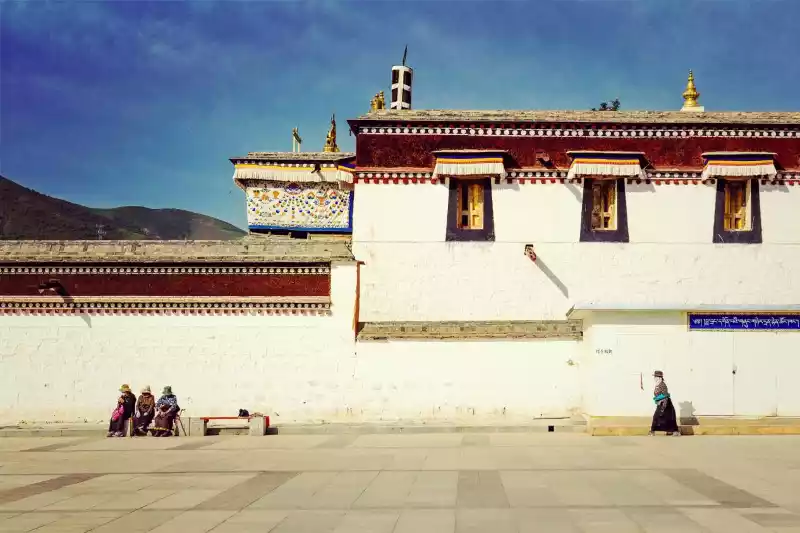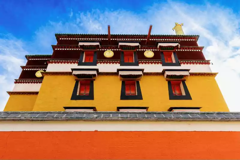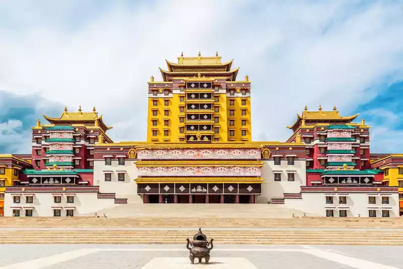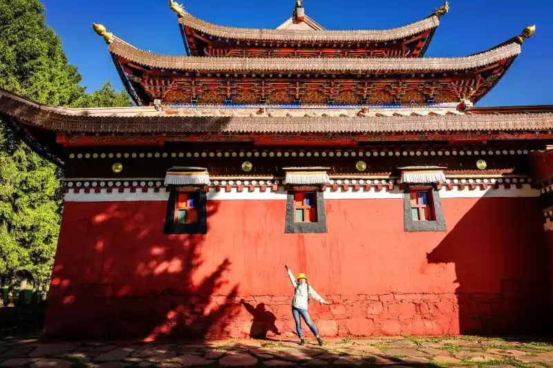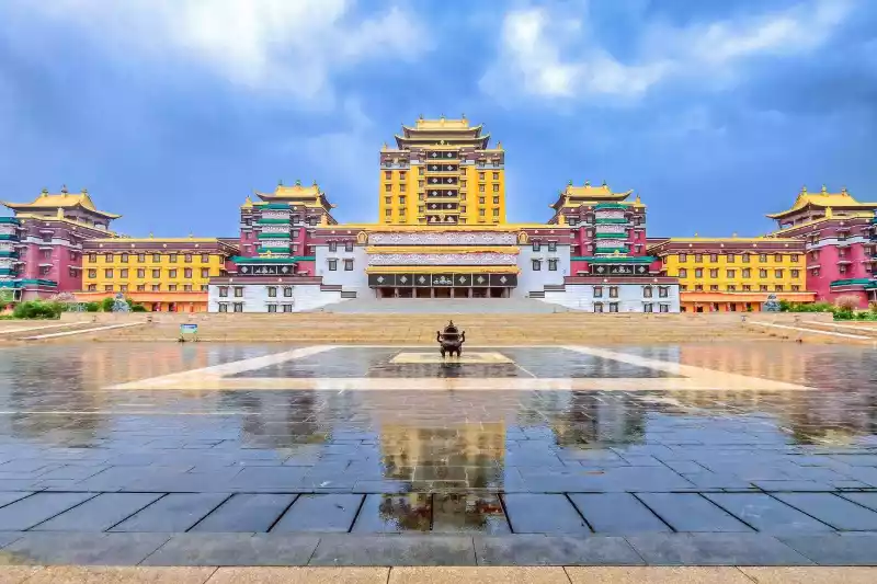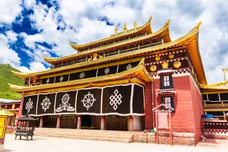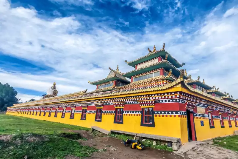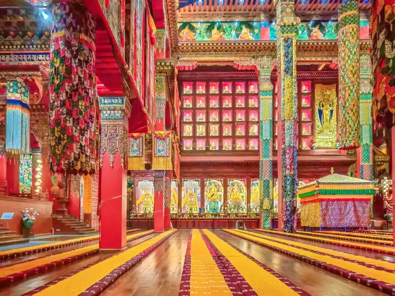 the outside, the thirty-five-meter-high main hall of the Gomo Monastery gives people a solemn and sacred feeling. Intricate decorations, extended corridors, empty squares, and thick nanmu columns in front of the hall highlight its low-key and luxurious in every detail.