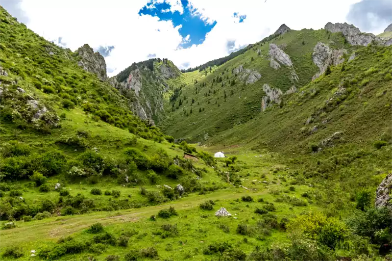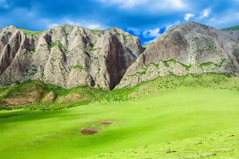 With the blue sky and white clouds, the cliffs and grass show new and clear colors.
