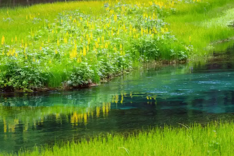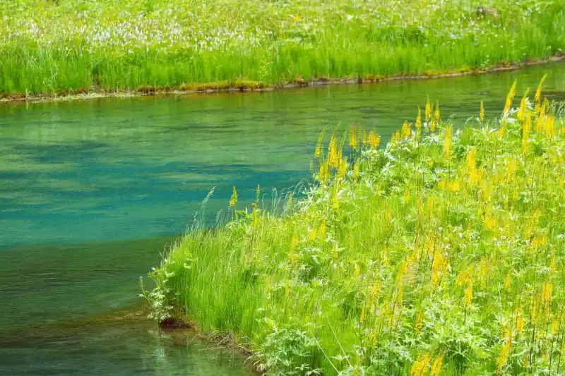 road is lined with wildflower-filled grasslands and wetlands with meandering rivers.