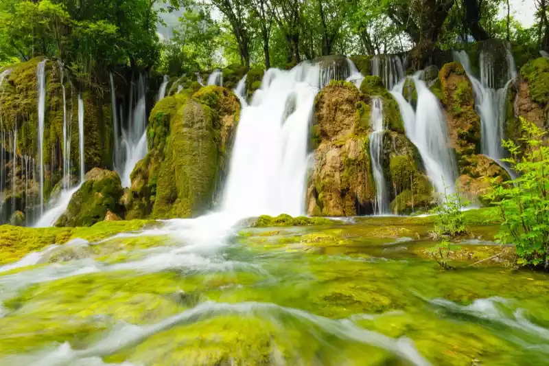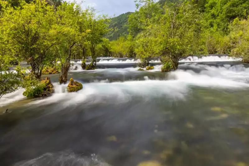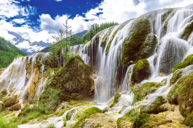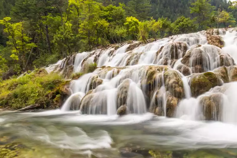 Pearl Beach is also one of the highlights of Jiuzhai, where strings of water droplets fall from the slopes of the tidal flats, and under the sunlight, they are like crystal pearls sprinkled on the world. Both the image and the sound interpret what is called "big beads and small beads falling on the jade plate".