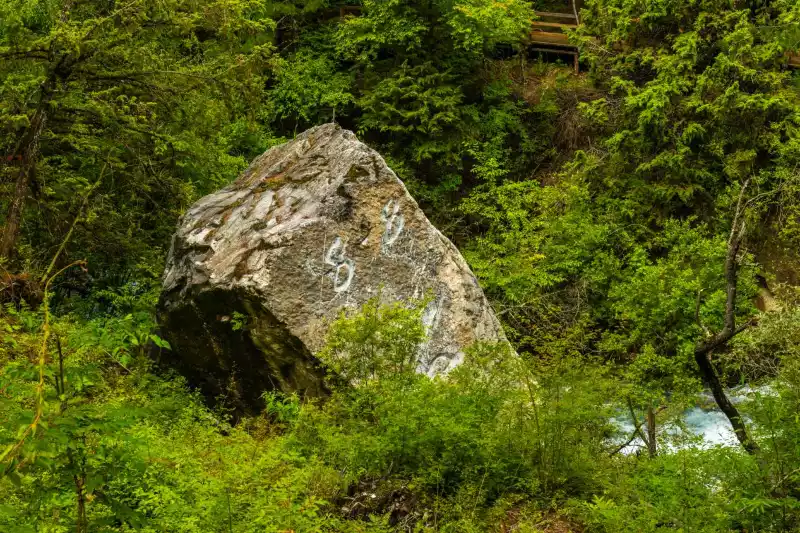 On the boardwalk from Pearl Beach Waterfall to the parking point, you can see a boulder at the foot of the mountain with the words "8.8 Earthquake Stone" engraved on it. It is a boulder that rolled down the mountain during the Jiuzhaigou earthquake in 17, and now you can still see the deep imprints of it rolling down all the way down in the valley, which makes people feel the power of nature.