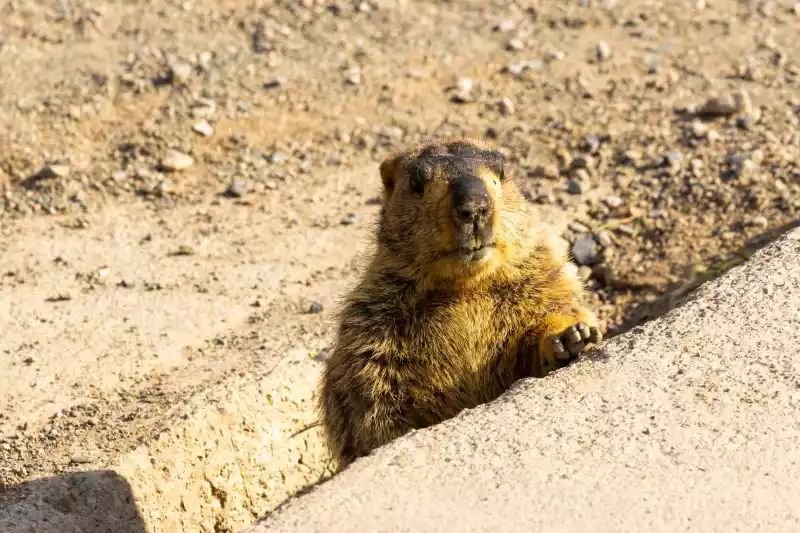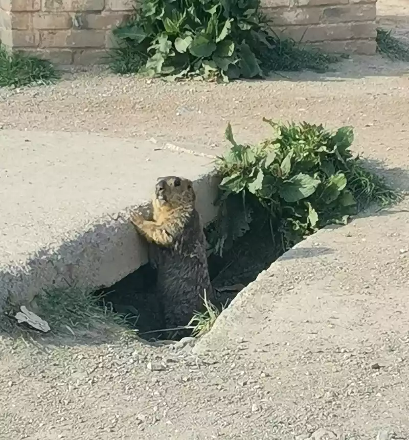 Returning to the parking lot in front of the temple from the foot of the cliff, we saw a groundhog sticking its head out of a hole in the gutter. I was surprised by its fat figure, and its bold style that did not shy away from others also refreshed my understanding of it. At first, it looked vigilantly, and after observing the environment, it stayed in place with confidence, even if you approached slowly, it did not shy away, but looked at it with its eyes to calculate what benefits you could bring to it.