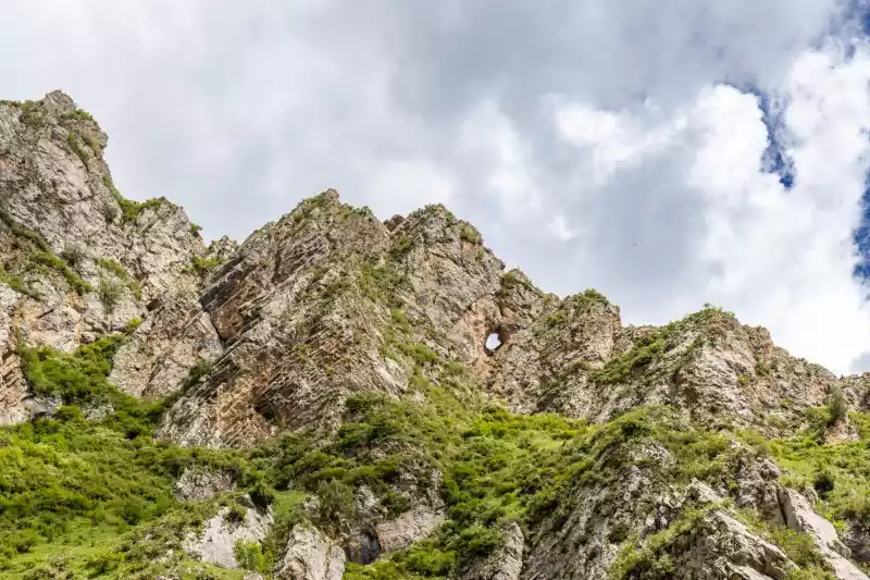 Again to the open lawn, the peaks almost circled it, and there was a round hole on the top of a high mountain, which was amazing.