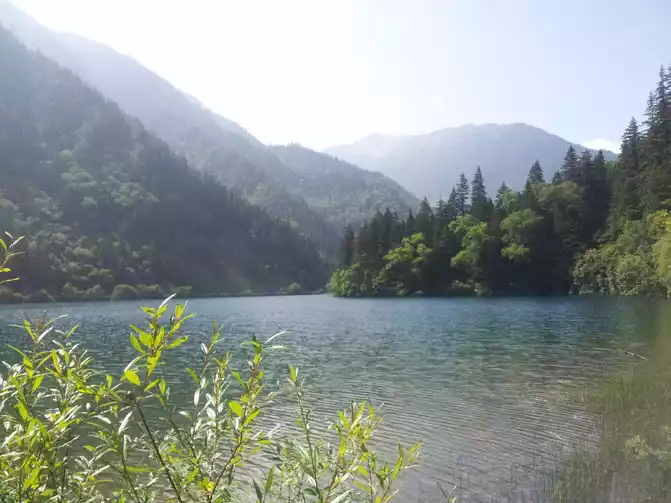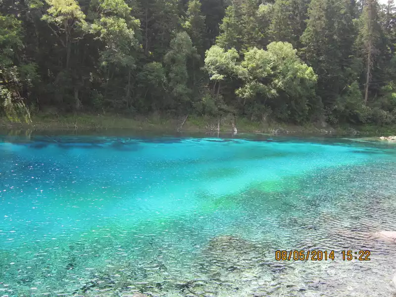 Jiuzhaigou didn't care about lunch that day, we brought our own dry food to eat and drink, and arrived at another ditch in the afternoon, the main attraction of this ditch is the apex of Changhai and the colorful pool. When I went up to Changhai, the weather was cloudy, and it seemed that it was going to rain soon, Changhai was a fairly open body of water, because of the dark clouds, the color was not as beautiful as it was seen in Rizegou. Hurriedly traveled all the way with the flow of people, walking for almost 30 minutes, before reaching the colorful pool, when the clouds cleared and the fog dispersed, and the sun just shone on the colorful pool, which was the most beautiful sea we saw today, integrating all the green and blue into a lake.