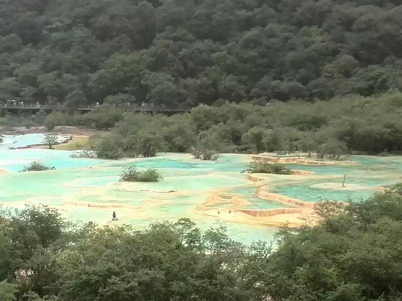 Climb all the way up the hill and finally reach the highest point, the colorful pool. My husband said that the current yellow dragon is not as abundant as he used to be, some pools have no water, and today is a cloudy and foggy weather, and the colorful pond is not as dazzling as when it is sunny, but the clouds and mist floating in the mountains add a bit of fairy atmosphere. Just like a beautiful woman, heavy makeup is always appropriate.