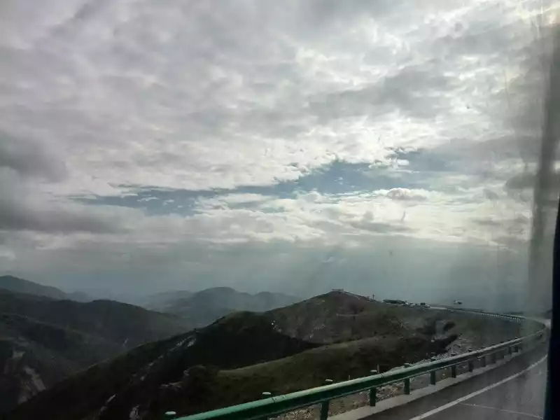 After seeing the beautiful scenery of Huanglong, I started to walk back, and I was going to stay in Maoxian County tonight, and the tour guide got the news that there was a section of the road that would be restricted before 7 o'clock, so I had to pass through that section of the road before 7 o'clock. Master Zheng, the driver known as the pangolin, took us on the mountain road. When I reached the top of the mountain, a thick fog shrouded me, and visibility dropped sharply, as if I was driving in the clouds. More than 20 minutes later, suddenly a ray of sunlight shone down, and as the altitude dropped, we broke away from the clouds and mist, looking at the white clouds swirling on the top of the mountain, and the sun in the west passed through the gaps in the clouds, which was really a rare beauty. This scene should only be on the mountain, how can I see it a few times in the city.