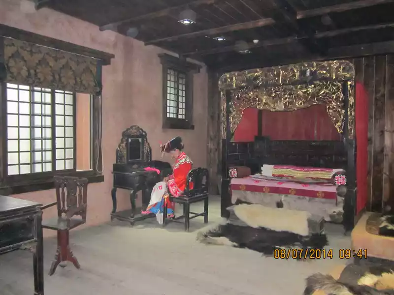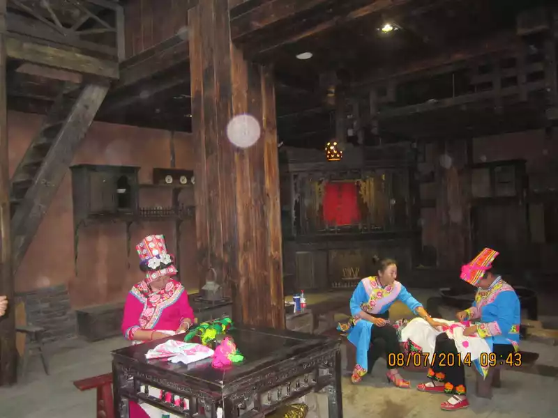 Then we arrived at the Qiang village, where the Qiang king and queen (actors) welcomed guests from afar at the gate of the city tower, and with the grand initiation ceremony, we were led by a Qiang girl to visit the rooms of the Qiang village one by one, and the Qiang people recreated the life scenes of the Qiang village in the rooms. In the middle, I talked to the tour guide girl, and she said that they used to use peppercorns as their main economic income, but after the earthquake, the peppercorn forest was destroyed, and now the government has introduced them to a cash crop called maca. Usually, they also have to learn the intangible cultural heritage of the Qiang people, such as weaving, dancing, and Qiang flutes, because these crafts are in the hands of the elderly, and few young people know how to do it, and the Qiang people have no writing and can only rely on word of mouth to inherit the national culture.