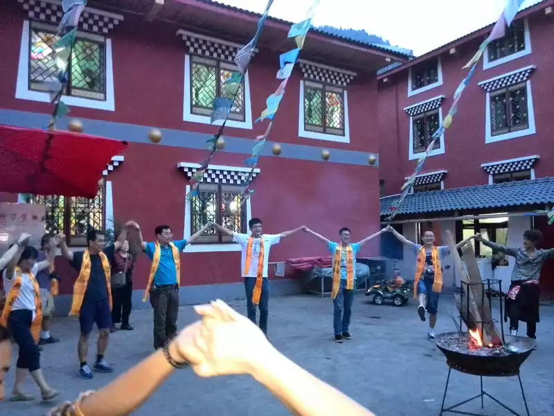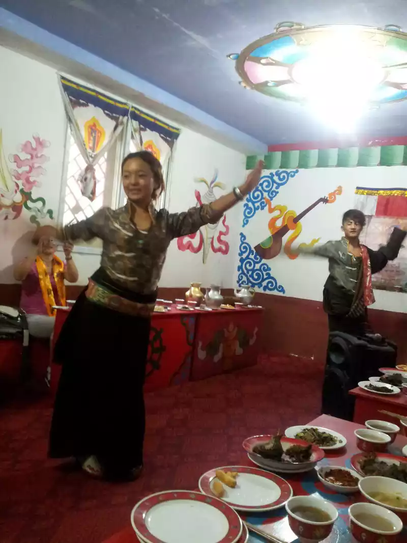 At 17:30 in the afternoon, we arrived in Jiuzhaigou County, and the tour guide took us to the collector's house as a guest. This is a self-funded project, which is included in the tour fee, and other tourists volunteer. Everyone sat around the table, and there were Tibetan guys and girls entertaining us, and everyone was in front of them with braised yak meat, highland barley cakes, butter tea, highland barley wine, wild vegetables, and oil barley. Let's drink and eat meat like Tibetans. They explained the customs and habits of collectors, there were song and dance performances, and a young man named Zeldan was said to have appeared on a CCTV talent show and sang really well. Then go downstairs to jump the pot, the music actually has little apples, we just have fun, this is too much with the times.
