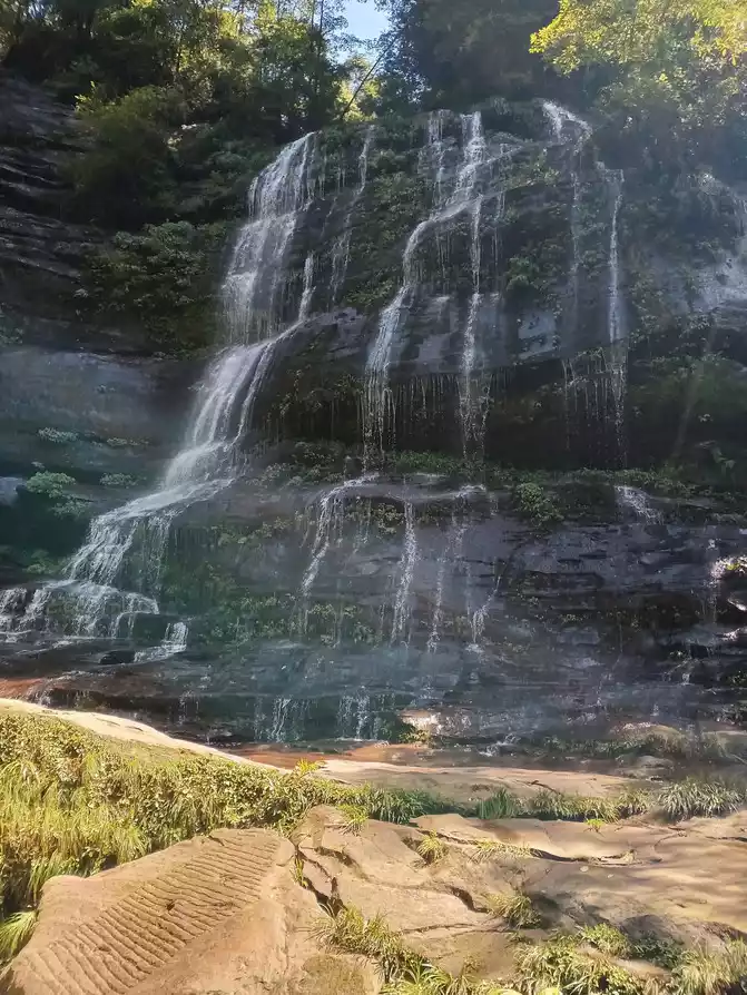 I got up at 7:30 the next morning. The steamed buns, porridge, and fried egg noodles handmade by the boss are sufficient in portion, 10 yuan per person. We still bought a pass and took a transportation bus to Zhengtai Mountain. This time, I still visited Zhengtai Mountain - Panlong Waterfall first. On the way, we still experienced the previous attractions and continued to move forward, passing by Zhiyin Spring, Concubine Pool, Concentric Stone, Herb Stacked Creek, Moon Cave Flying Water, and Panlong Waterfall. Among them, the Qintai stone is a testimony of the love of Sima Xiangru and Zhuo Wenjun, which is quite romantic. The noble concubine pool is the place where Tang Xuanzong asked the Taoist priest Yang Tongyou to summon the soul of Yang Guifei. Panlong Waterfall is magnificent and spectacular. Return to Bailongdu the same way and take a ferry to Shibali Herb Gully. This route is steeper and more rugged, not suitable for the elderly and very small children. Most of the attractions are artificial entertainment facilities, and the play experience is average. Due to time and physical strength, I did not visit other attractions below the main rooftop, and returned home at 16 o'clock.