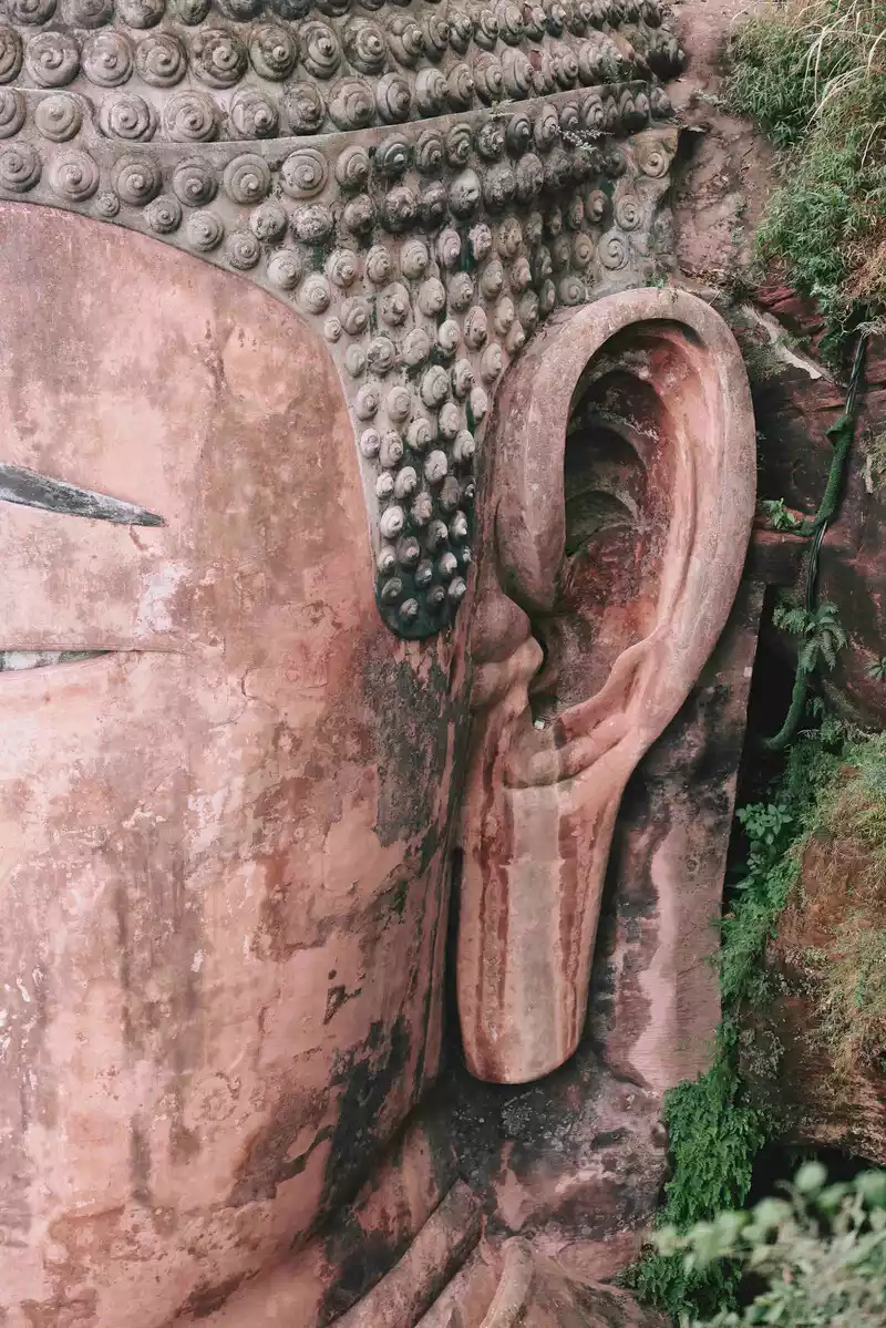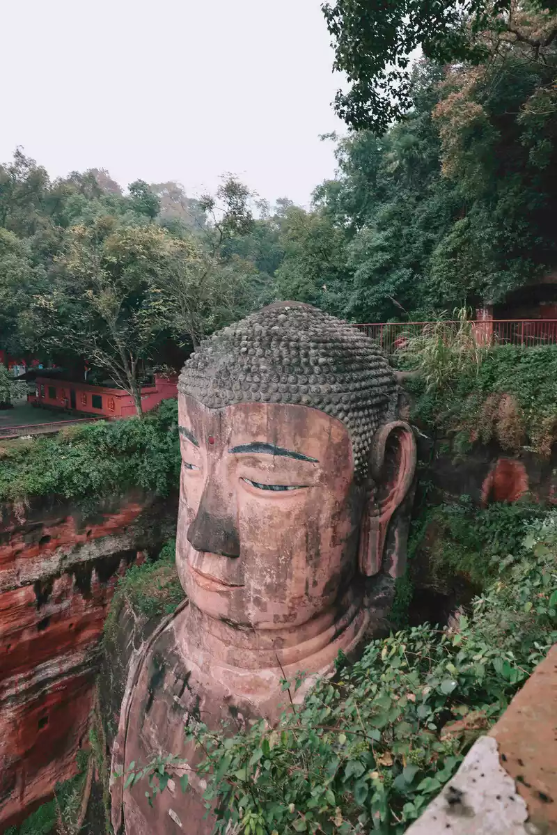 The carving process of the Leshan Giant Buddha can be called the essence of ancient art. The facial expressions of the Buddha statues are serene and peaceful, and the meticulous carvings bear witness to the exceptional skills of the craftsmen. The overall structure of the Buddha statue combines the surrounding natural environment and cleverly utilizes the natural shape of the rocks, so it blends in with the mountain. The Buddha's head is wide, with drooping earlobes and a majestic body, symbolizing wisdom and compassion.