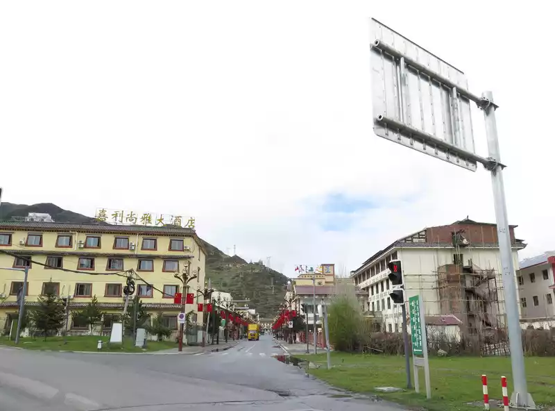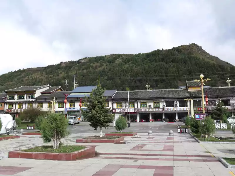 A square with scattered Tibetan buildings scattered far and near, It is dotted with brightly colored decorations.