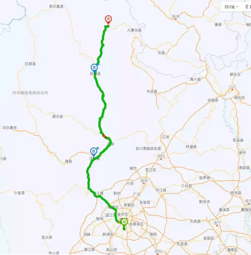 Today's driving route map, about 430 kilometers, passing through Dujiangyan, Wenchuan, and Maoxian , Songpan County.