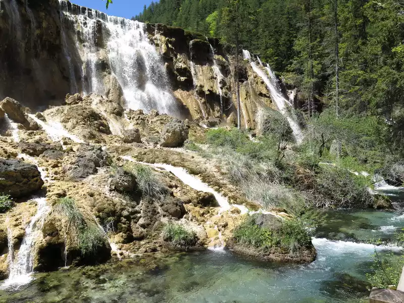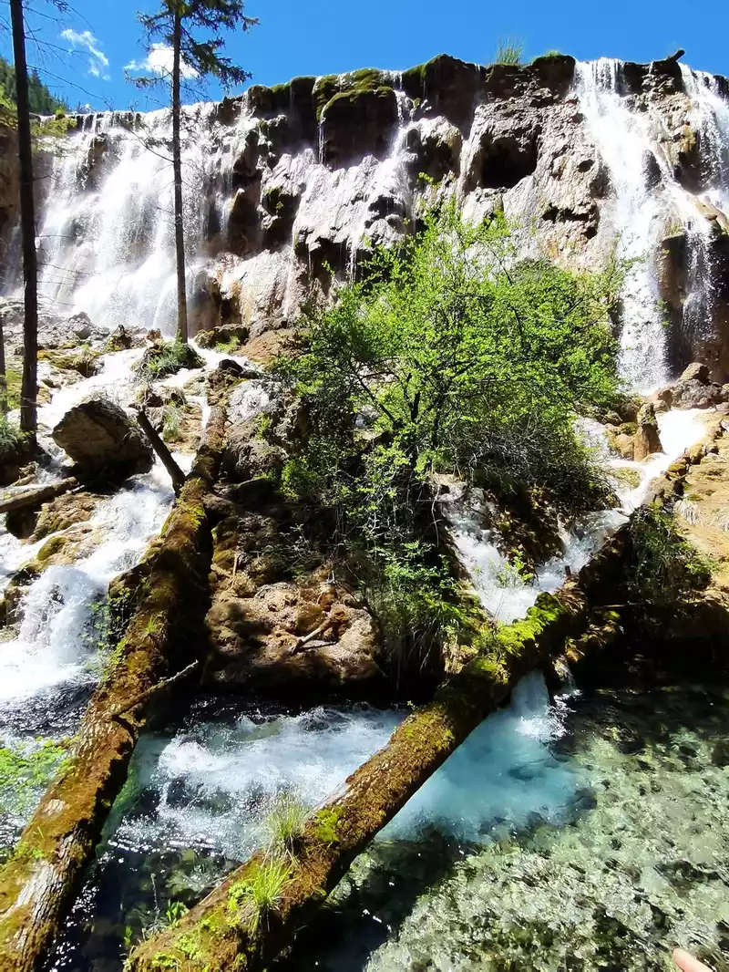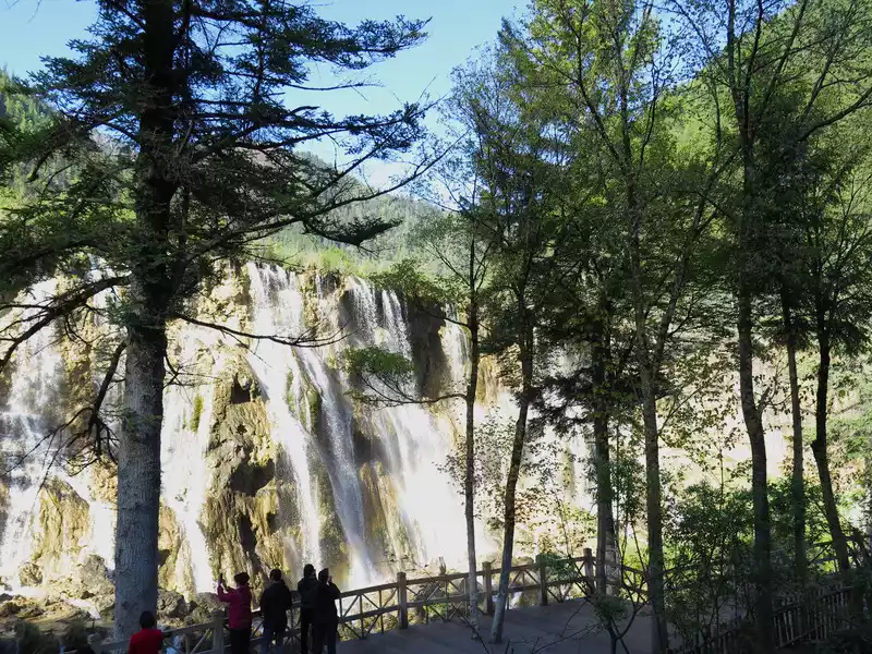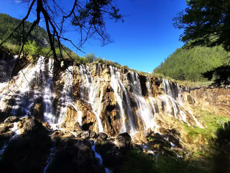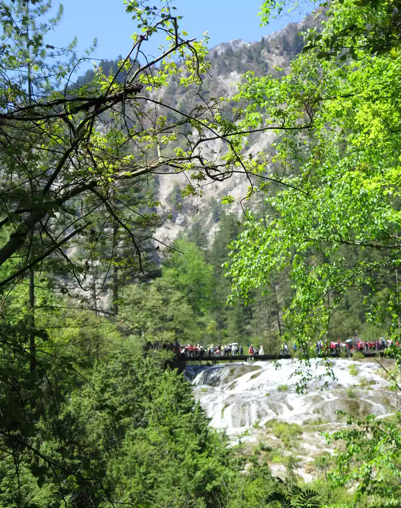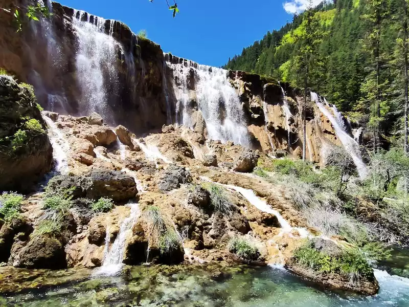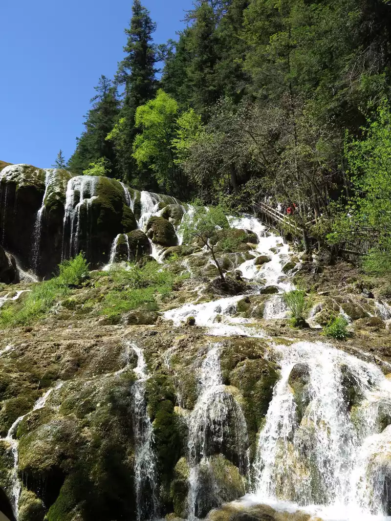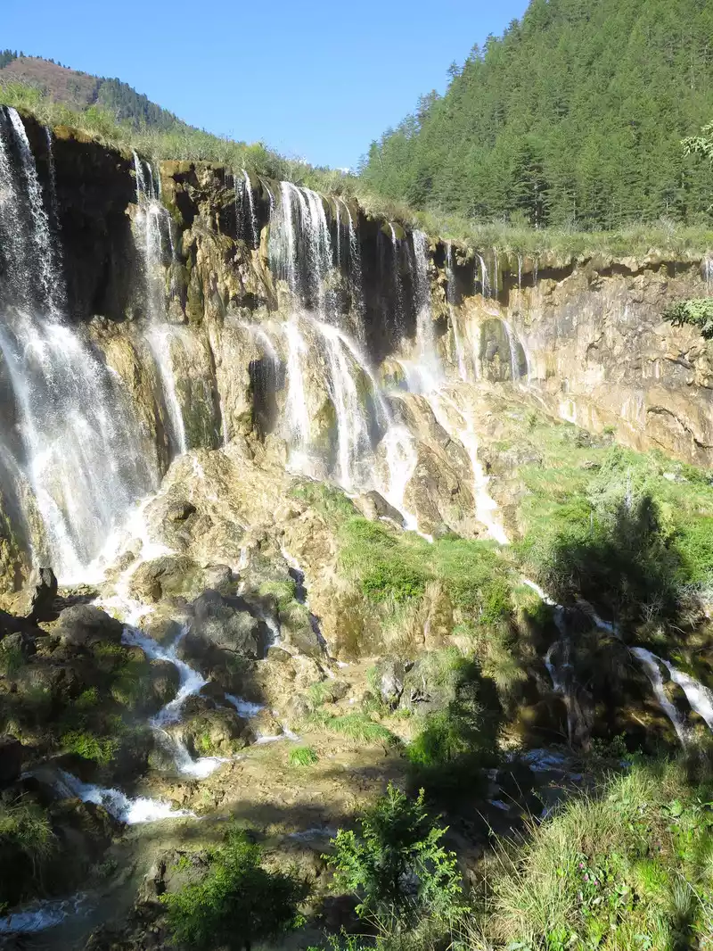 Pearl Beach Waterfall is 21 meters high and 270 meters wide. The water rushing from the pearl beach rolls down from the edge of the cliff, forming a wide crescent-shaped waterfall, like the Milky Way falling from the sky, rolling up thousands of waves. The waterfall fell to the bottom of the valley, emitting a deafening roar, forming a splashing torrent, which was the most beautiful, the most rapid, and the loudest among all the rapids in Jiuzhaigou.