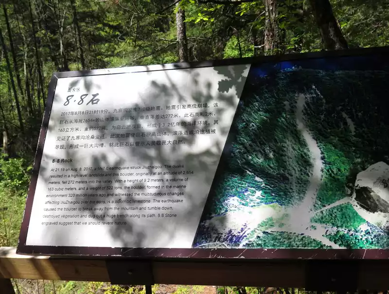8.8 stone, On August 8, 2017, a magnitude 7.0 earthquake occurred in Jiuzhaigou, and a boulder rolled from a mountain at an altitude of 2,654 meters into a river valley.