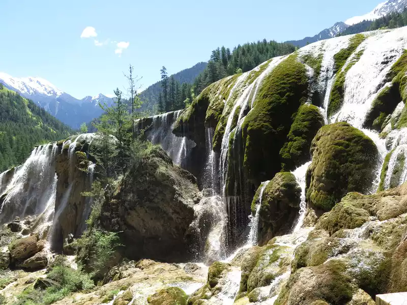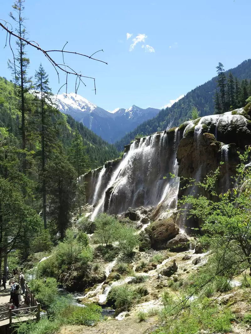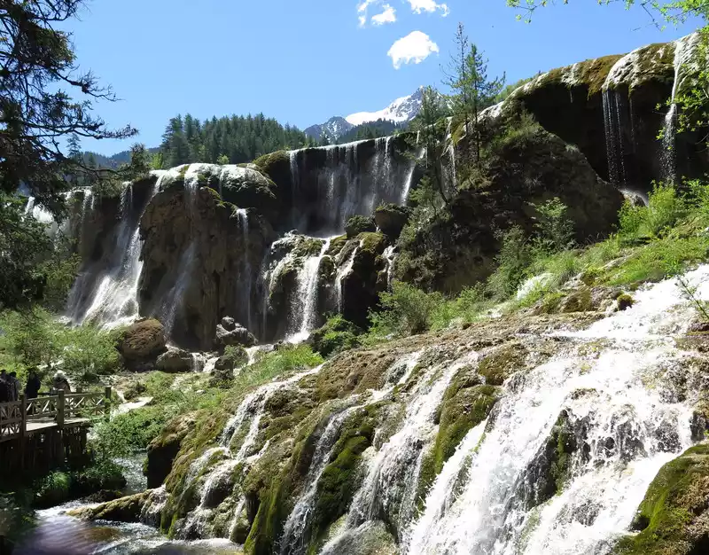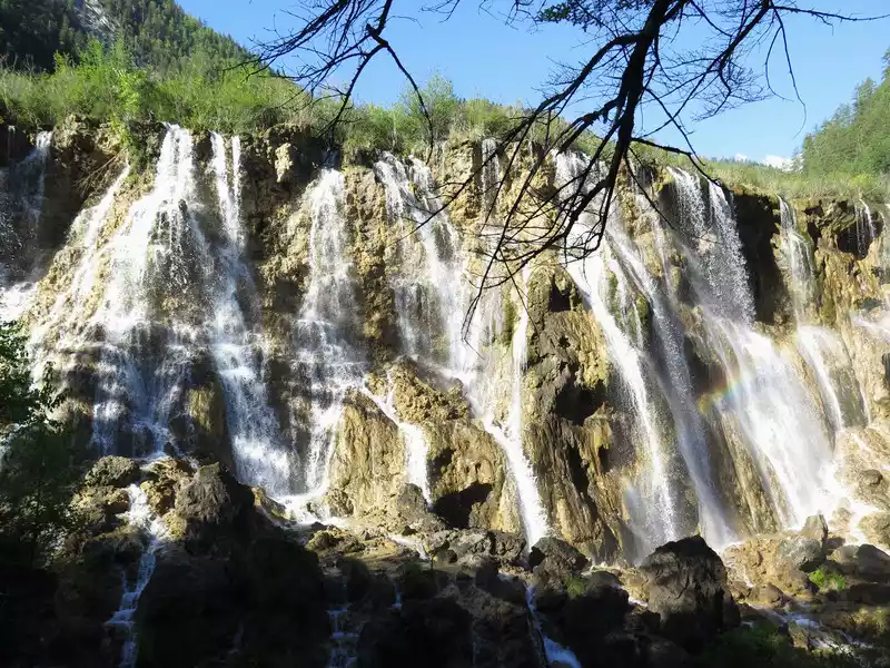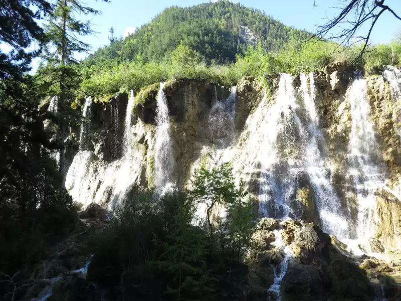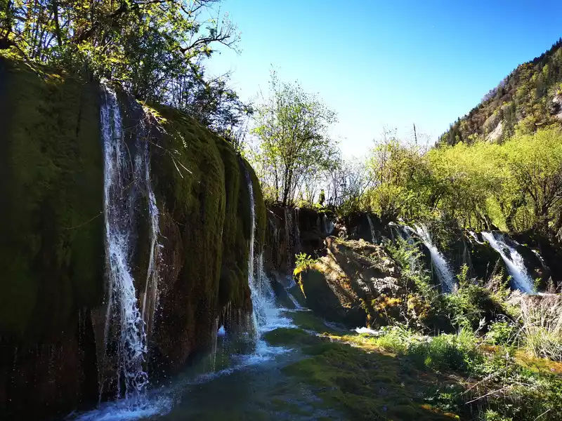 There are many waterfalls in Jiuzhaigou, which are diverse and wonderful. They often flow quietly from tree-lined cliffs or beaches, and many waterfalls are divided into countless small streams, either light and slow, or rushing down. In addition, the surrounding mountains are green and green, which is extremely beautiful.