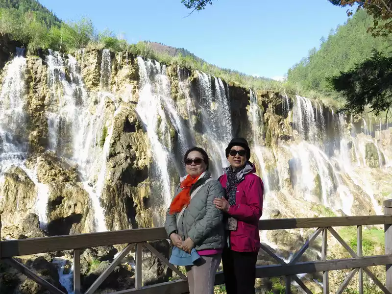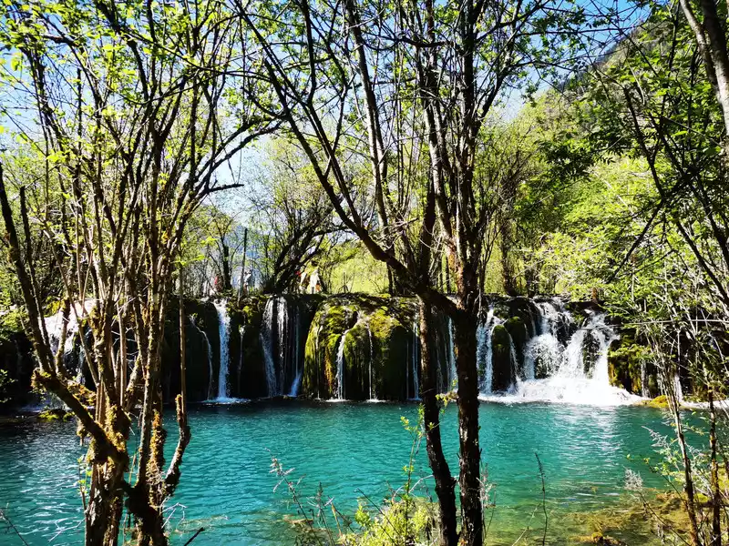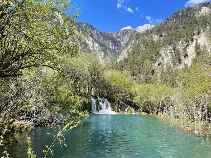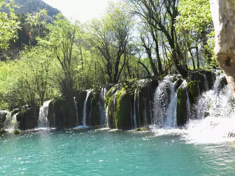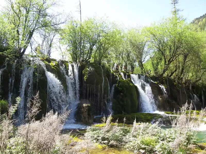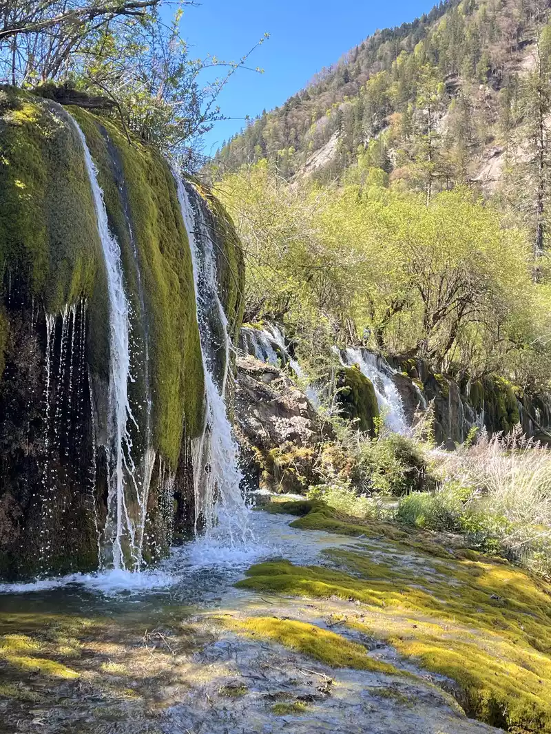 There are many waterfalls in Jiuzhaigou, which are diverse and wonderful. They often flow quietly from tree-lined cliffs or beaches, and many waterfalls are divided into countless small streams, either light and slow, or rushing down. In addition, the surrounding mountains are green and green, which is extremely beautiful.