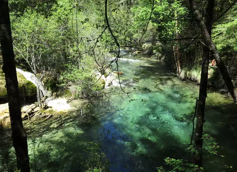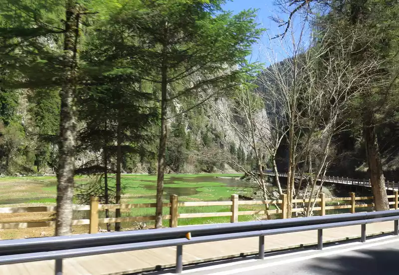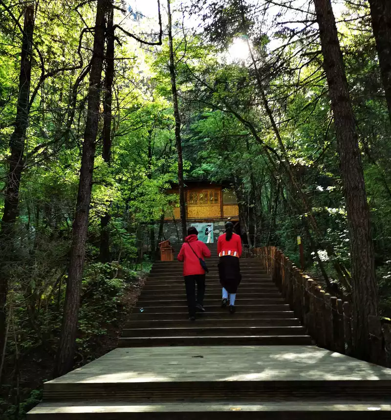 At the end of the trestle on the north side, you can slowly descend along a steep ladder downwards, and you can see a flying stream flying out from under the trestle and falling straight into the deep valley, which is the Panda Sea Waterfall. The waterfall is 80 meters high, which is the largest drop among the Jiuzhaigou Waterfalls.