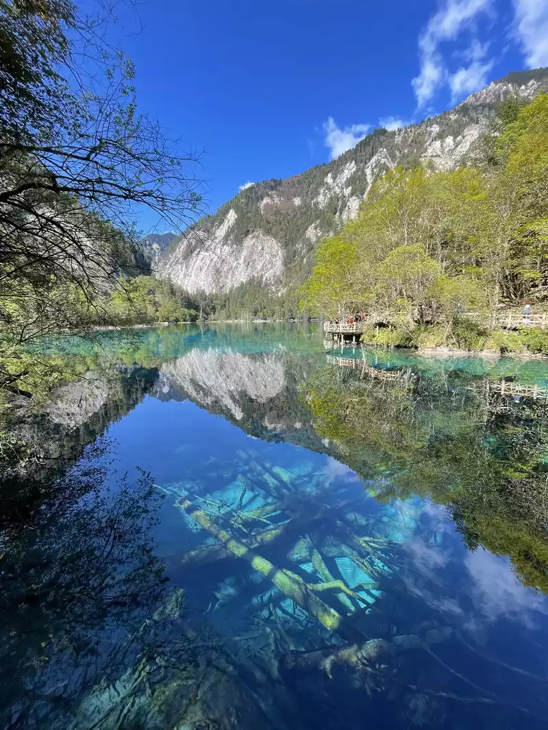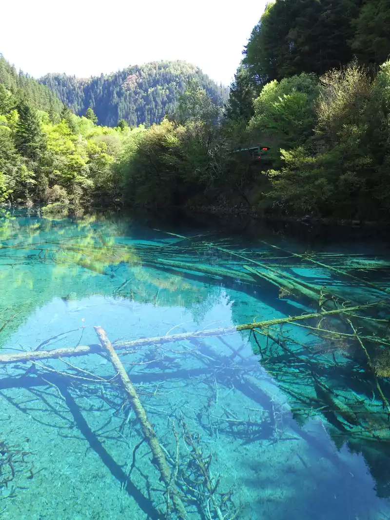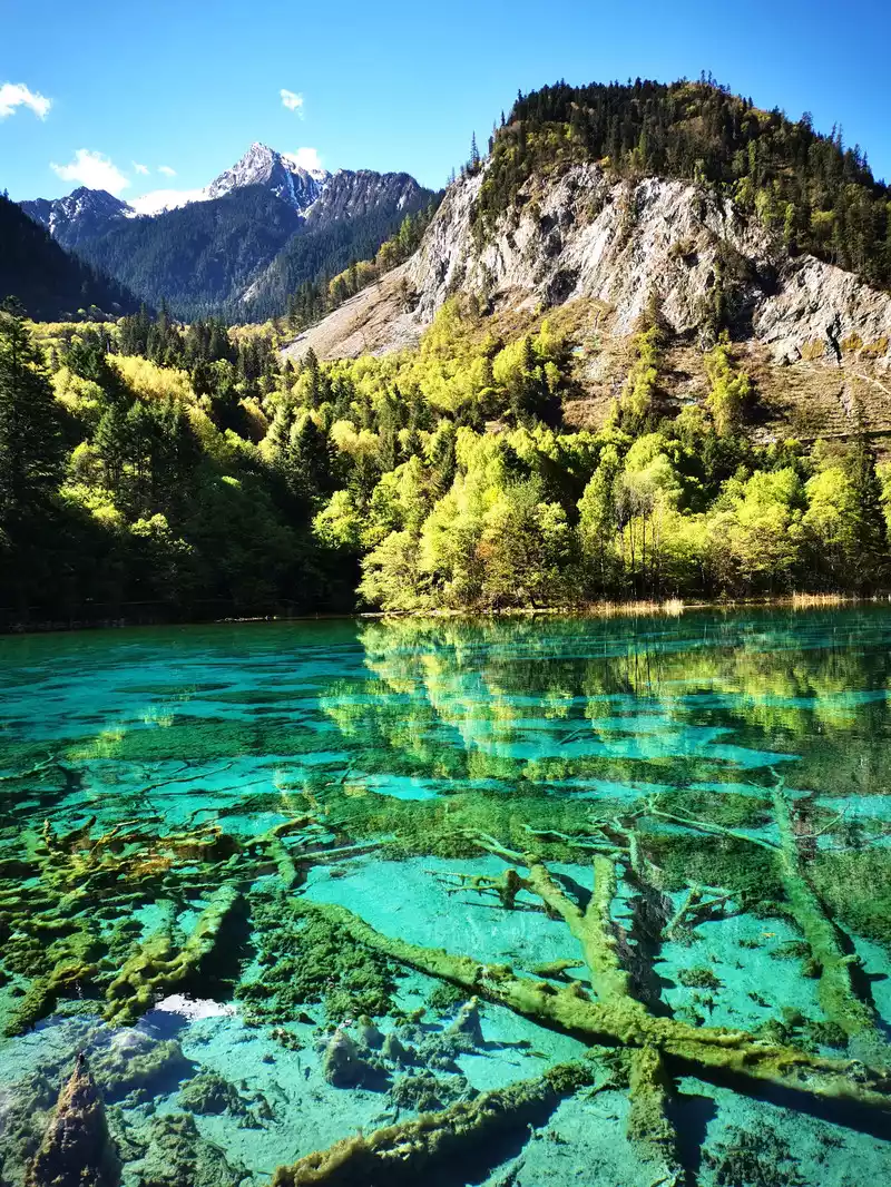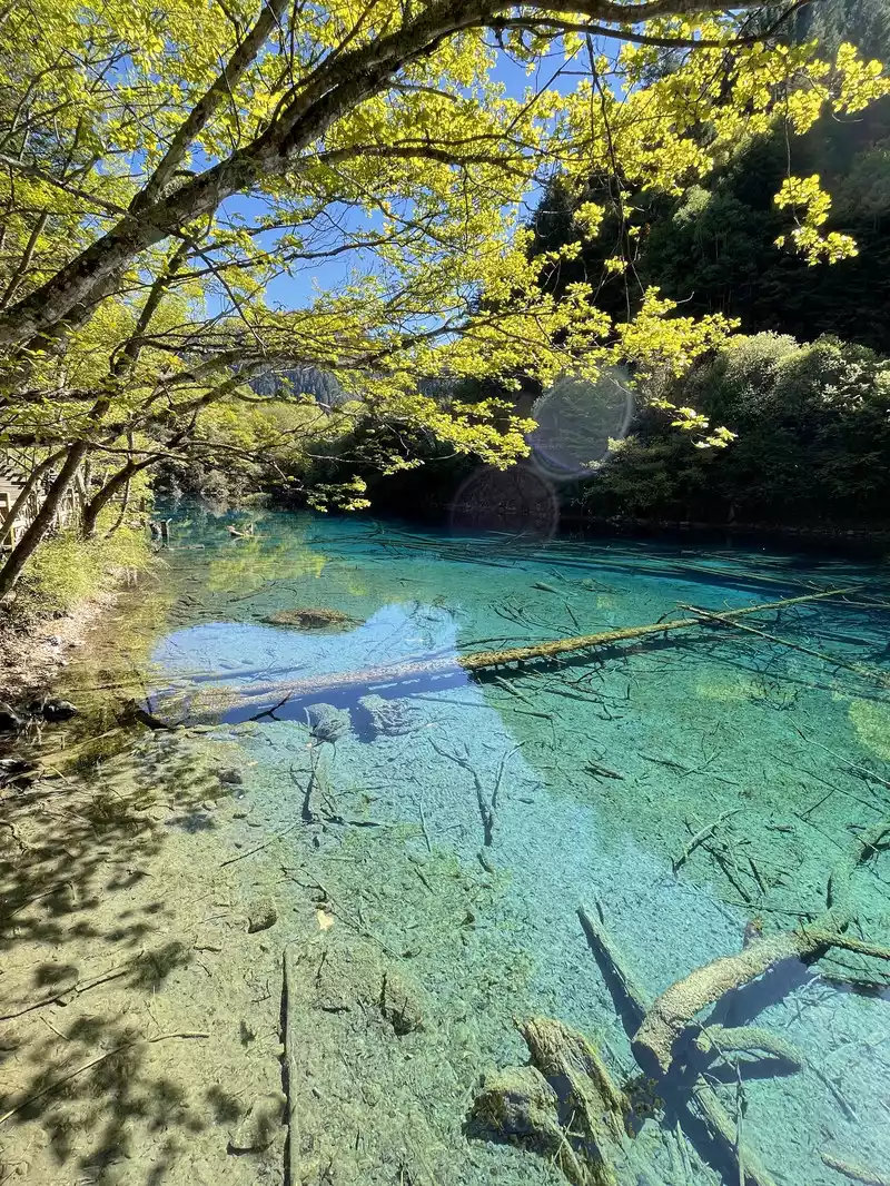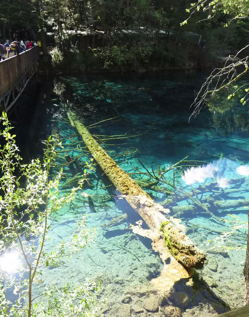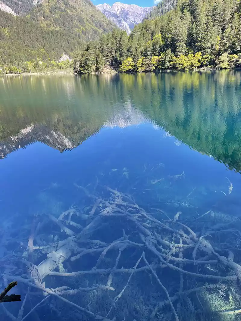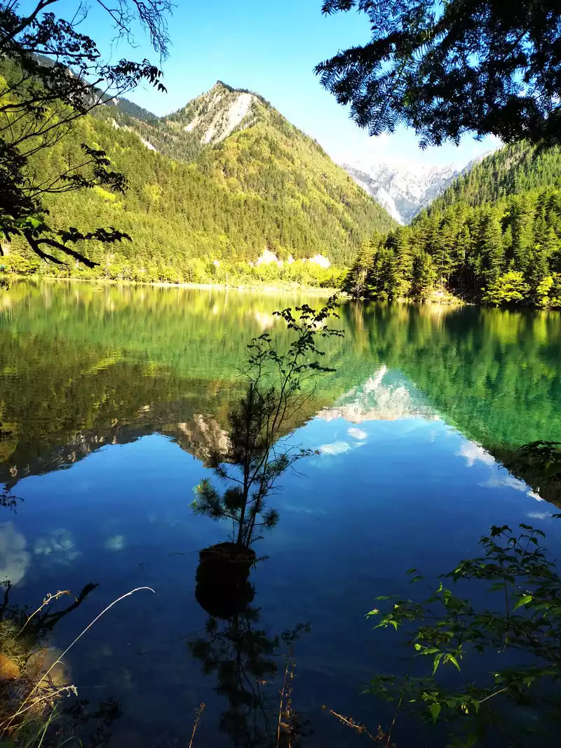 The calcified dead wood in the lake forms a peculiar landscape. The most amazing thing is that some dead wood is half exposed to the water, and there will be new saplings on it to take root, and this regenerated tree has become a major feature of the Arrow Bamboo Sea, called "rotten wood renewal" or "dead wood spring".