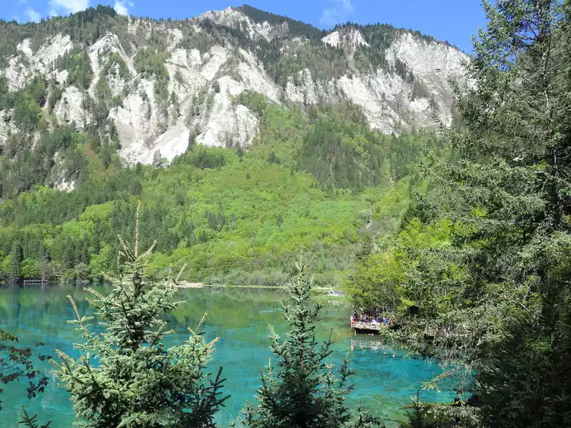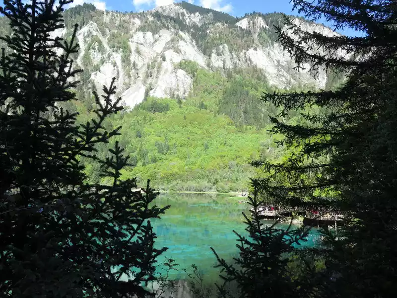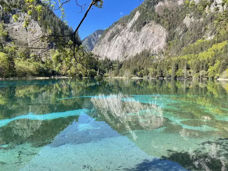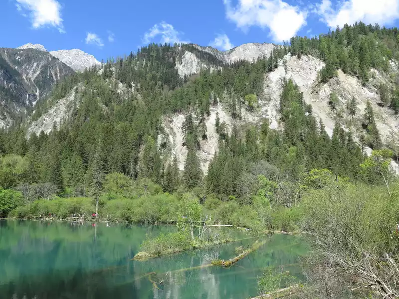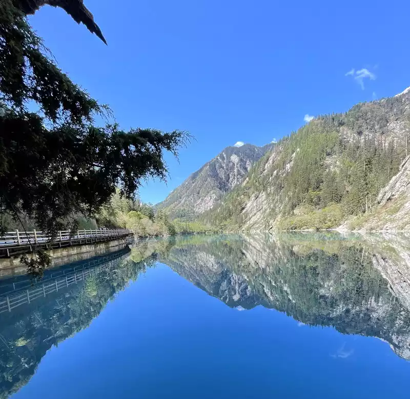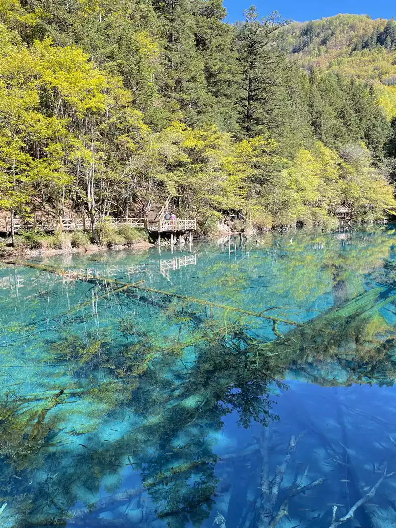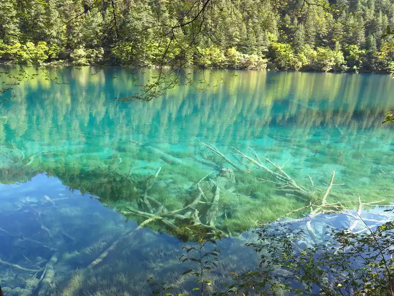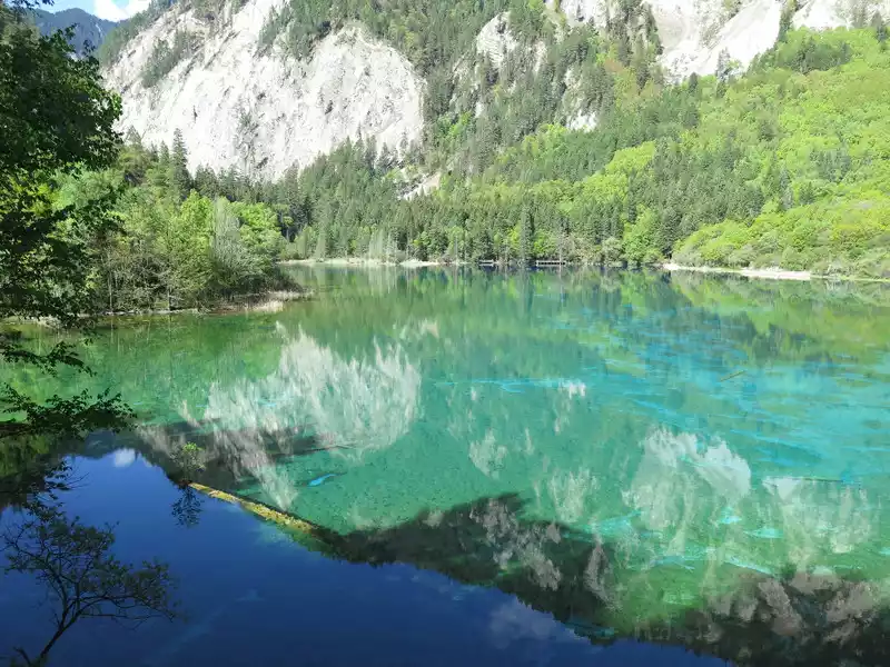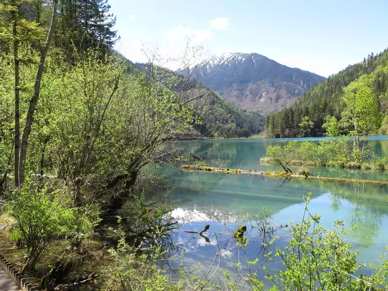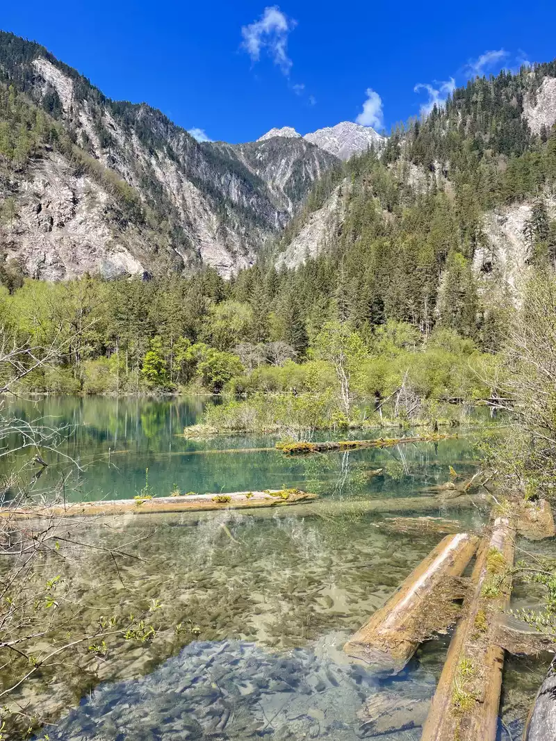 The calcified dead wood in the lake forms a peculiar landscape. The most amazing thing is that some dead wood is half exposed to the water, and there will be new saplings on it to take root, and this regenerated tree has become a major feature of the Arrow Bamboo Sea, called "rotten wood renewal" or "dead wood spring".