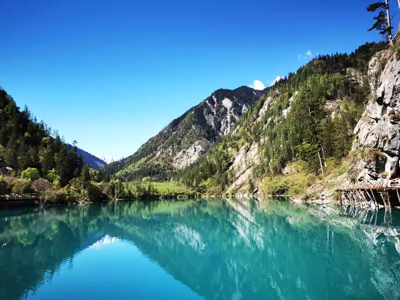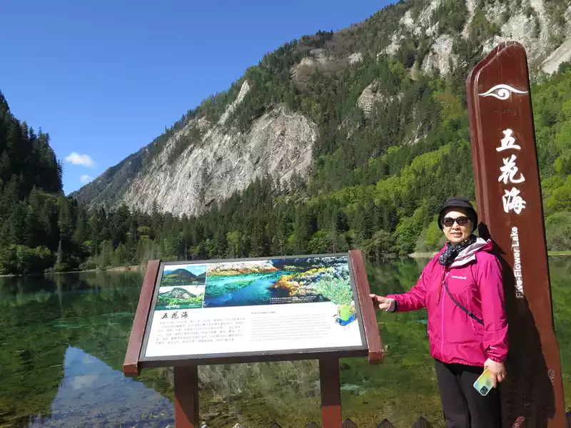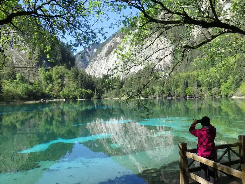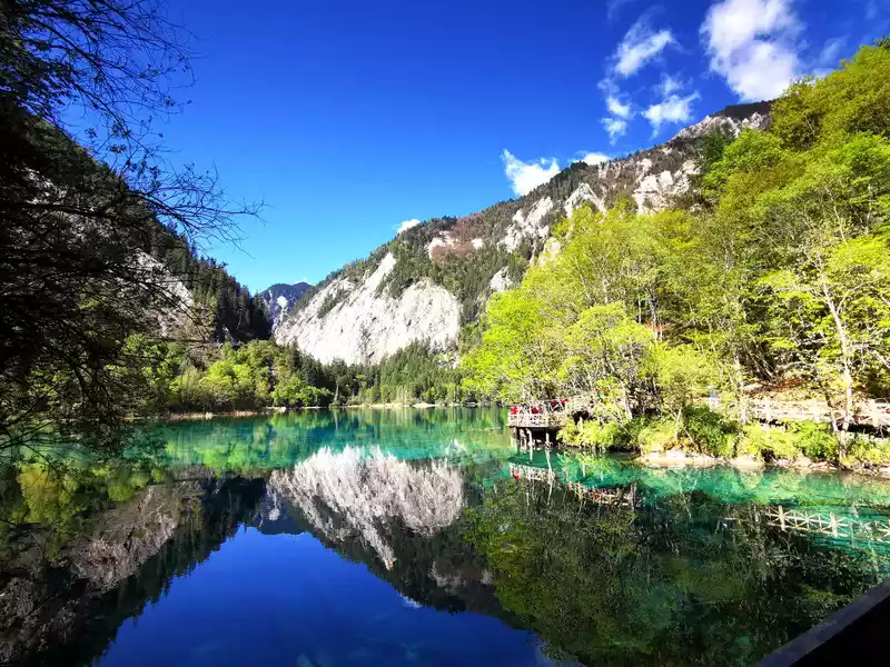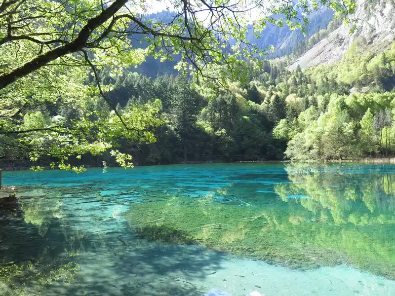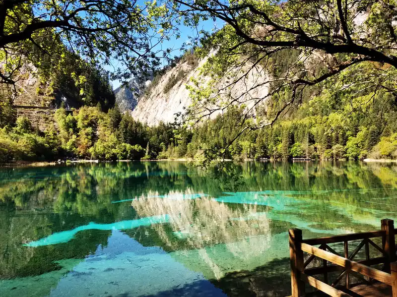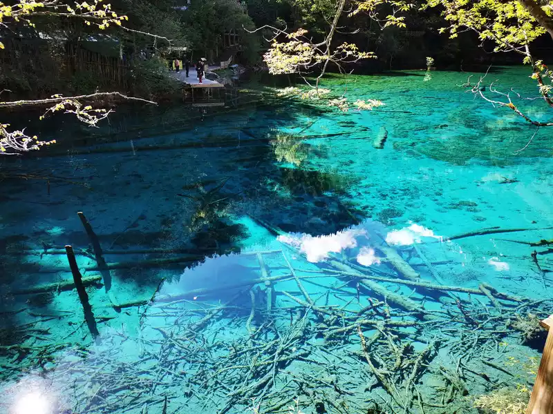 The autumn colors of the Five Flowers Sea are the most beautiful, and the surrounding hillsides are shrouded in a brilliant color, rich in colors and thousands of postures. Colorful leaves are intertwined into a brocade, like flames flowing gold. The pool water containing calcium carbonate and the aquatic community containing different chlorophylls transform into colorful colors under the action of sunlight, clusters and pieces, blue, dark green, and emerald yellow.The forests on the shore are reflected in the pool with red, orange, yellow and green, and they are colorful, and the sunken trees and plants under the water are intertwined, which is beautiful.