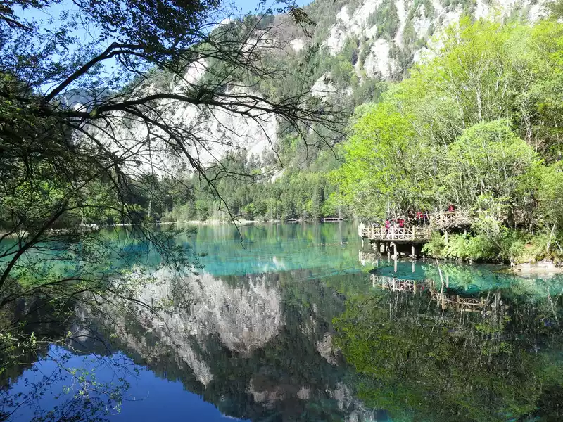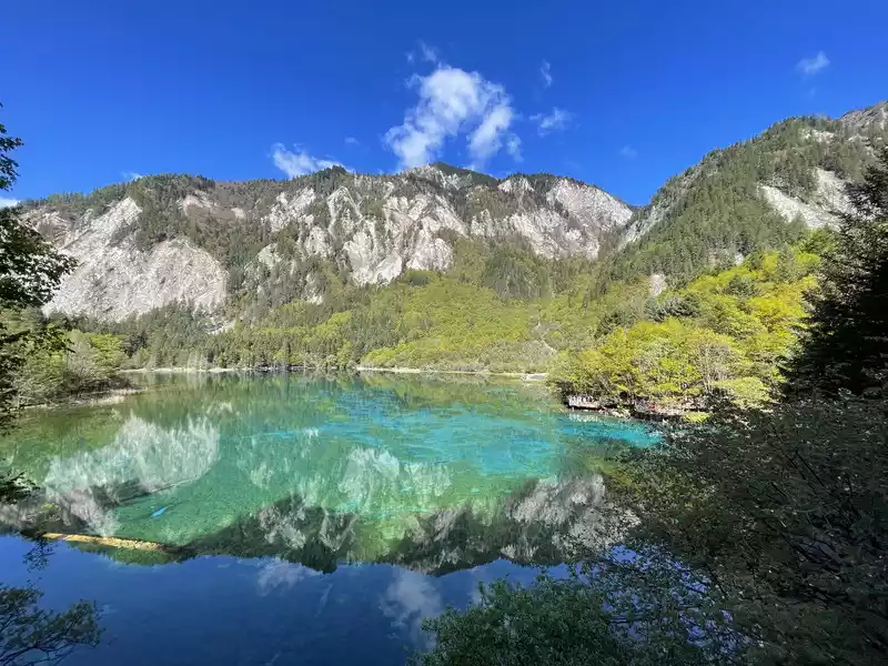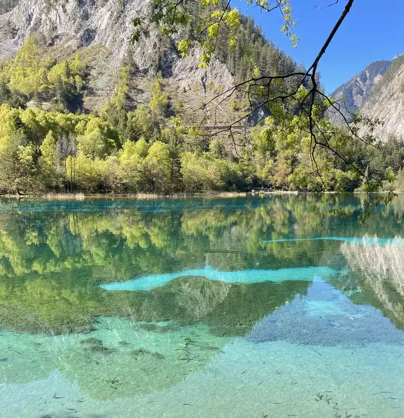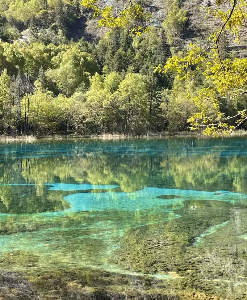 The color of the Five Flowers Sea is rich in variation, mainly due to the reflection and refraction of light by travertine deposits at the bottom of the lake, aquatic plants, and lake water at different depths. The lake water shows different colors such as blue-green, golden, and milky white under the sunlight, like a flowing oil painting.