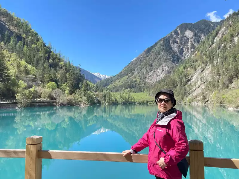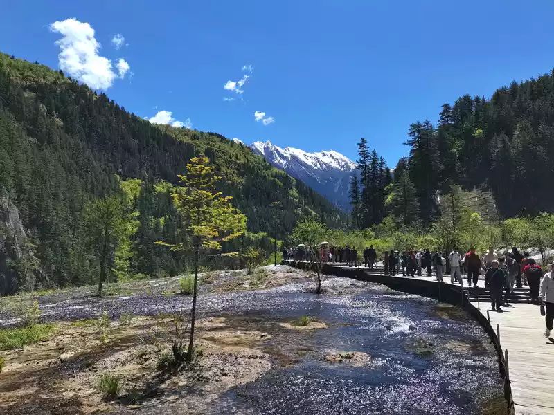 Today's weather is extremely powerful, the temperature is suitable, the blue sky and white clouds make the face of Jiuzhaigou show the highest and most beautiful appearance. We were so lucky, the next morning we visited Huanglong, and the weather was as good as today, but then on the way back to Chengdu, it gradually turned cloudy, and it started to rain when we walked to Yingxiu Town.