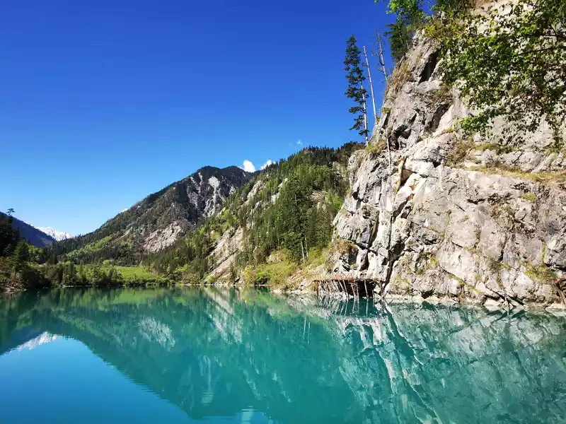 Panda Sea, surrounded by mountains, the lake water is crystal clear, and the rock walls by the lake have peculiar textures. It contrasts with the round stones with black patterns that grow naturally underwater on the shore of the lake.