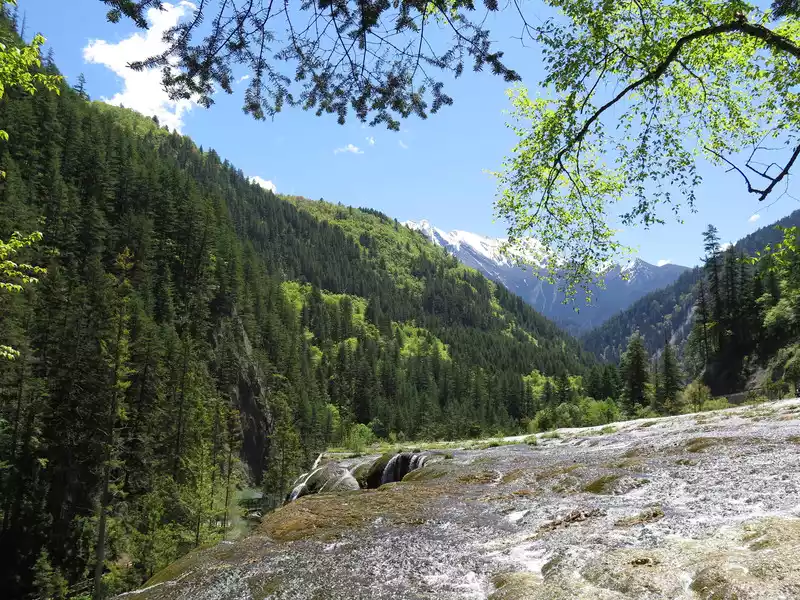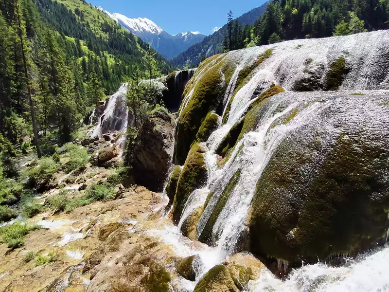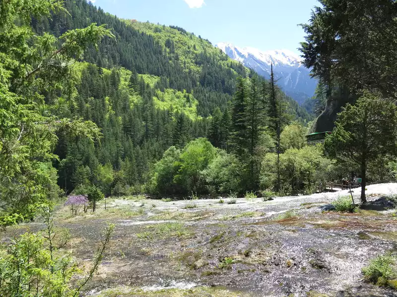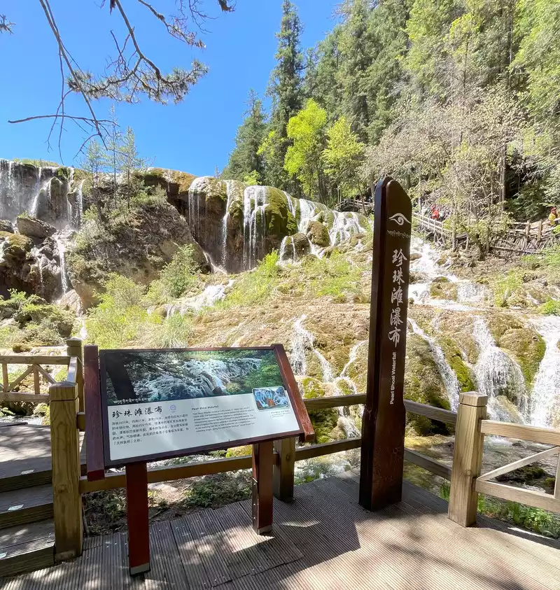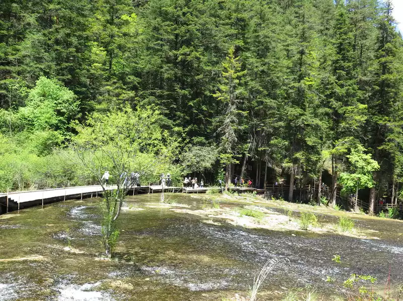 Pearl Beach, with an altitude of 2,450 meters, a beach width of 112.3 meters, a length of 189 meters, an average slope of 20 degrees, a relative height difference of 15 meters, and a variety of water-loving shrubs, is the widest beach surface in Jiuzhaigou, and is a large travertine accumulation platform formed by calcium carbonate deposits.
