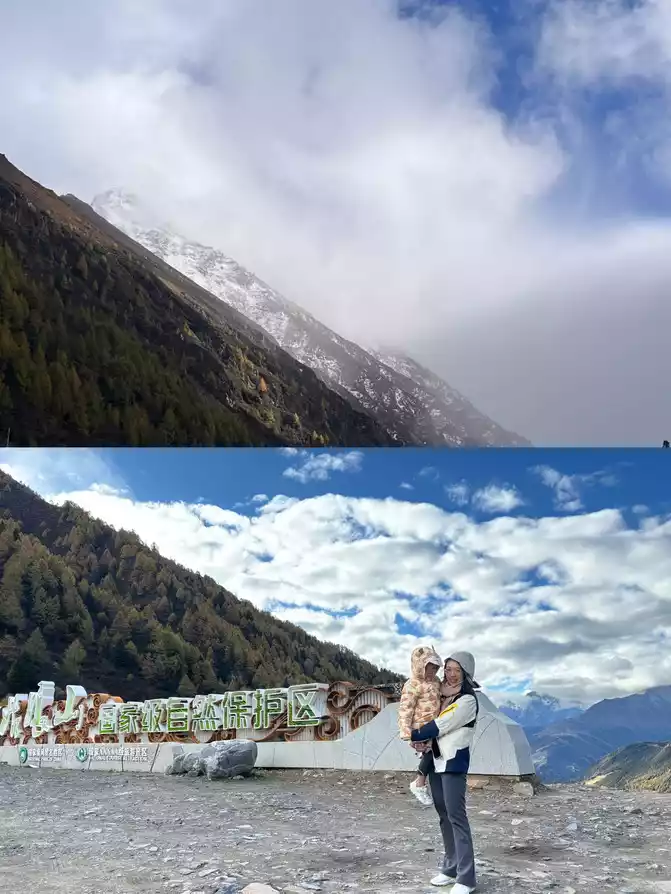 It's still very hot in Guangdong in October, so let's go to Sichuan to experience autumn. I said, "Let me take you to a very cold place." The child said, "Yeah, we can go play in the snow!" I heard it's possible to snow, but it snowed the night before we went to see the snow-capped mountains, so we missed it completely.