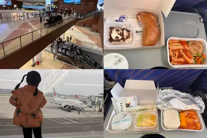 It wasn't my first time flying, but a 4-year-old's experience is different than a 3-year-old's. He was "wow wow wow" excitedly the entire way. He ate the children's meal, drank Coke, and saw the scenery. He finally said he had a slight earache and finally calmed down. Finally, he got tired and fell asleep, not even noticing we landed. After getting off the plane, I walked slowly and played on the slide. The weather in Chengdu is a little different from that in Zhuhai, so I changed my clothes before picking up my luggage.